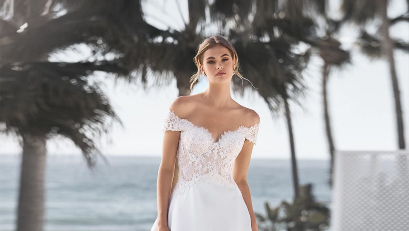 The Edie bridal gown by Pronovias is a sophisticated and elegant choice for a beach wedding. It boasts of a sultry off-the-shoulder neckline with an intricate lace bodice that flows into a voluminous A-line skirt that looks even fuller as the wind blows. It’s a dreamy dress that is perfect for brides who want to feel like a princess on their special day.