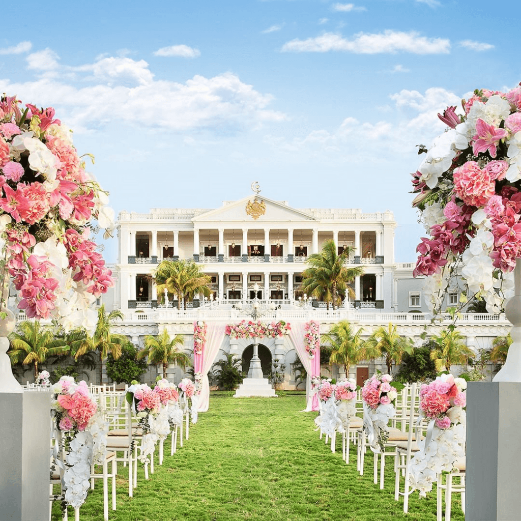 Ascend to the height of luxury at Taj Falaknuma Palace, a magnificent palace perched atop a hill in Hyderabad. This architectural marvel showcases a seamless fusion of Italian and Tudor styles, boasting ornate interiors, grand staircases, and expansive gardens. The palace offers a range of opulent venues, including lavish ballrooms, terraces, and sprawling lawns, where you can host your wedding celebrations amidst an ambiance of refined elegance. Taj Falaknuma Palace is the epitome of luxury and sophistication.