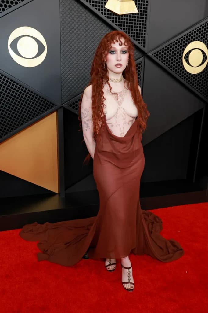 Chappell Roan closed the bridal conversation with a sheer burgundy Mugler gown that challenged the idea of what “bridal” even means. Silver rings suspended delicate fabric across the body, revealing piercings, henna, and body art beneath.