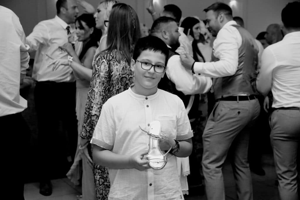 During the wedding reception, the bride’s shoe is “stolen” off her, with the thief taking to the stage to announce that they are holding it for ransom. The reason it is stolen is to stop the bride from dancing, which means no one else can dance. The thief then collects money from the guests to pay the ransom and when they have reached the target, both the shoe and the money are given to the bride.