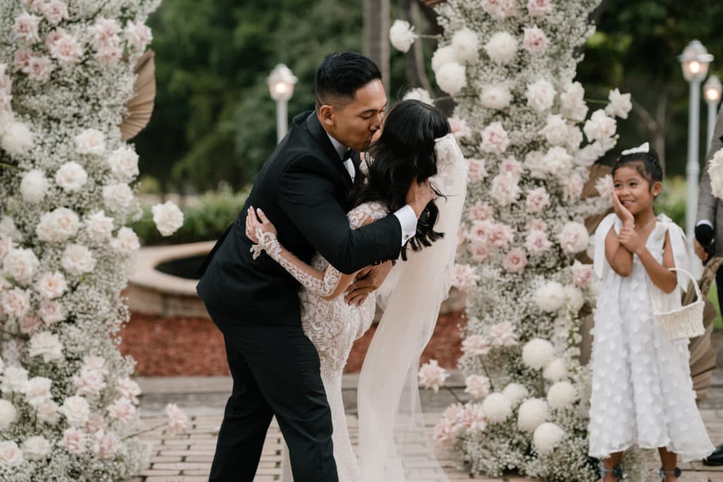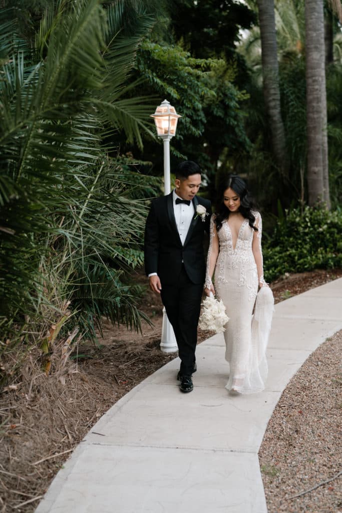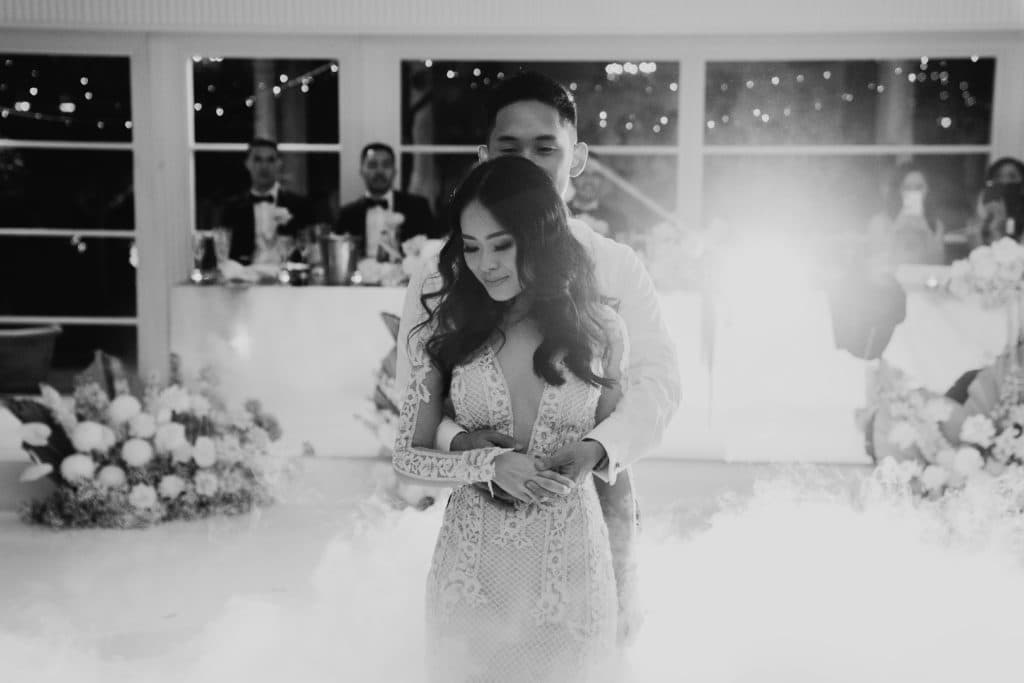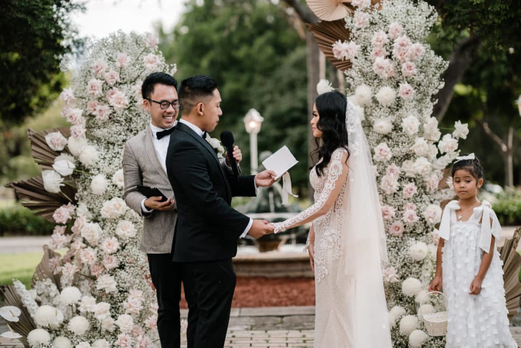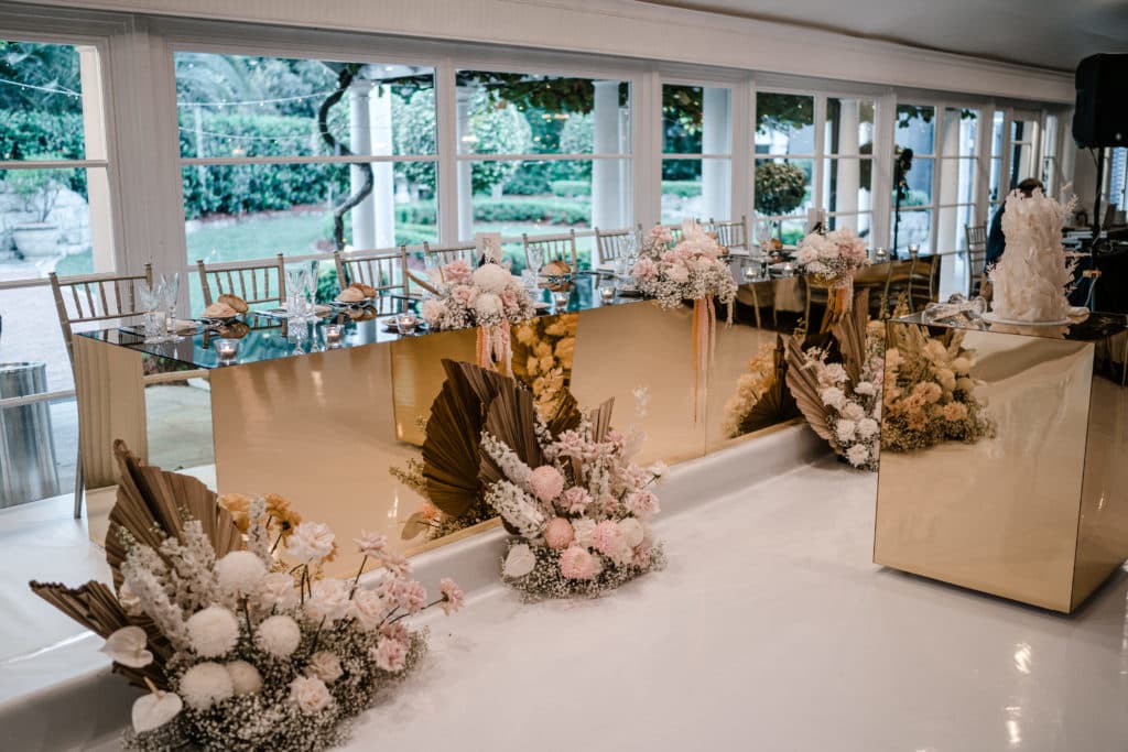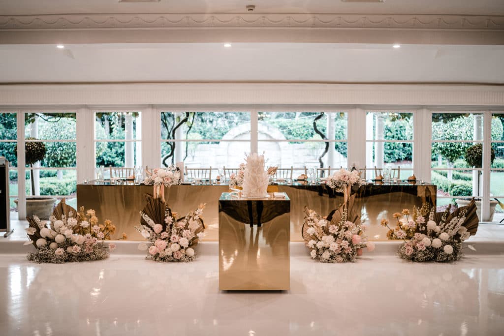 The couple said their vows in the breath-taking gardens, beneath an arch of baby’s breath and soft pink and white florals, while their reception was adorned in beautiful shades of pink, gold and white, creating a stunning ambience for the night ahead.