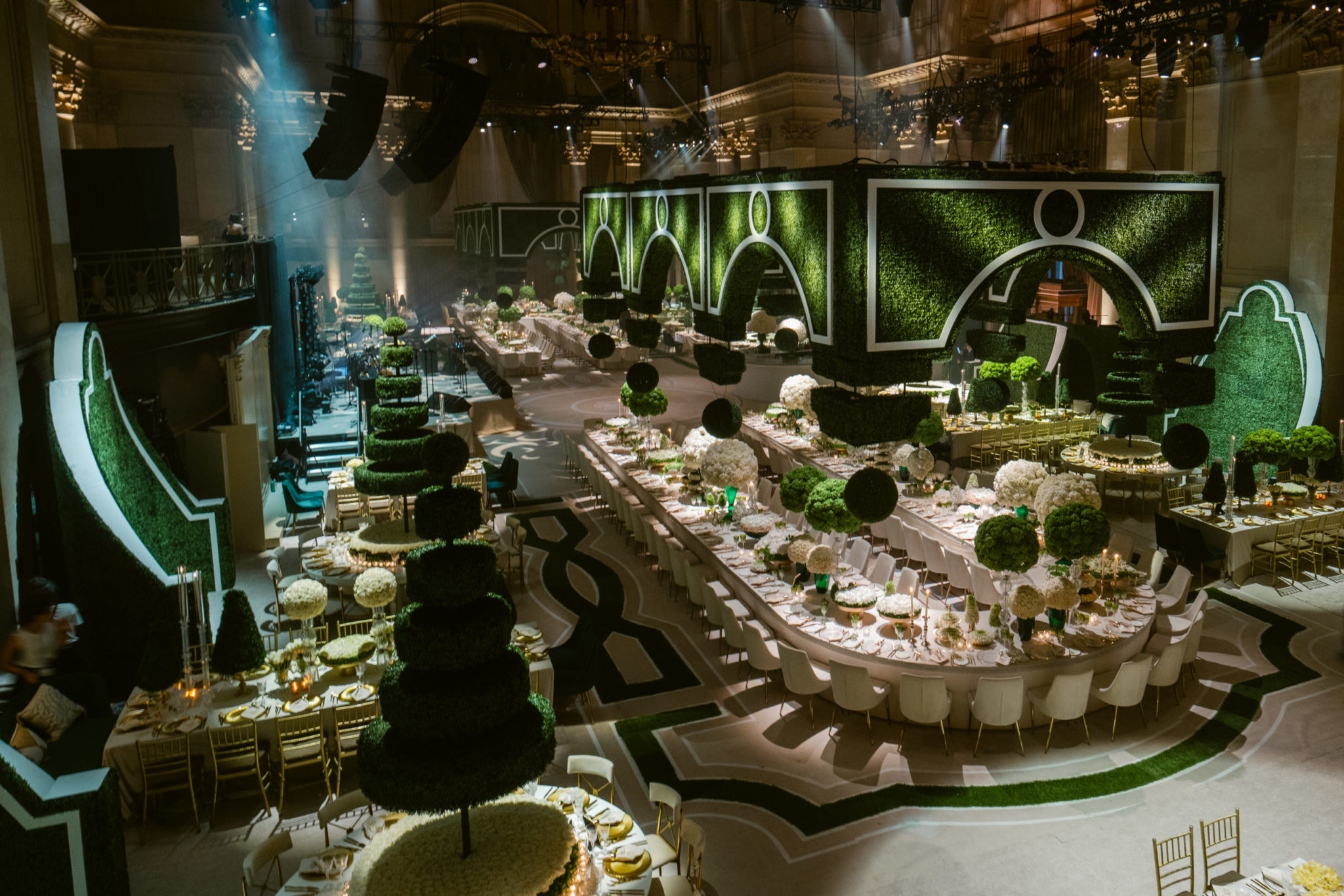 Sky Productions brought Europe’s lucious and luxurious gardens to Wall Street, New York for a 600 guest Jewish wedding! Nature’s elegance inspired the remarkable layers of this glamorous indoor garden reception and guests were amazed by the immaculate transformation. The tone for the event was set when guests were introduced by a 30-meter-long floral aisle grand entrance(Hello, high drama). With a touch of natural texture at every turn the wedding featured more than 20 types of Greener