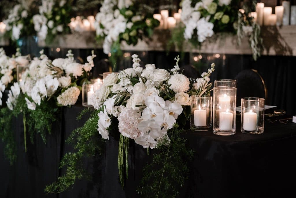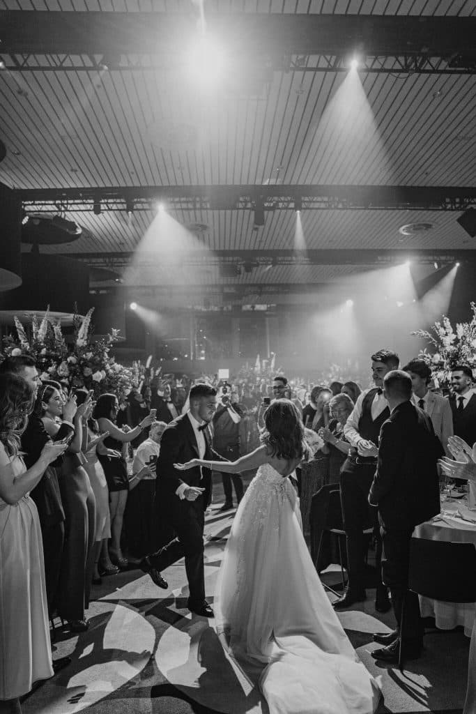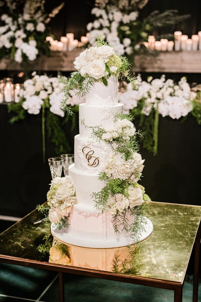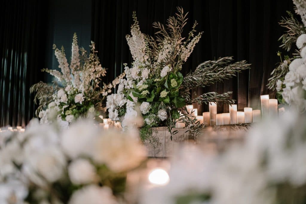 We are particularly in-love with the décor of this reception! The modernity of the dark room was complemented by innumerable candles, creating a romantic ambience for the evening, while shades of gold and green accentuated the surroundings. Intricate and elaborate floral arrangements of greens and whites decorated the tables, and even the cake! Daniel and Christina’s wedding perfectly combined aspects of modernity and elegance, while also creating a space for the couple to party all night long!