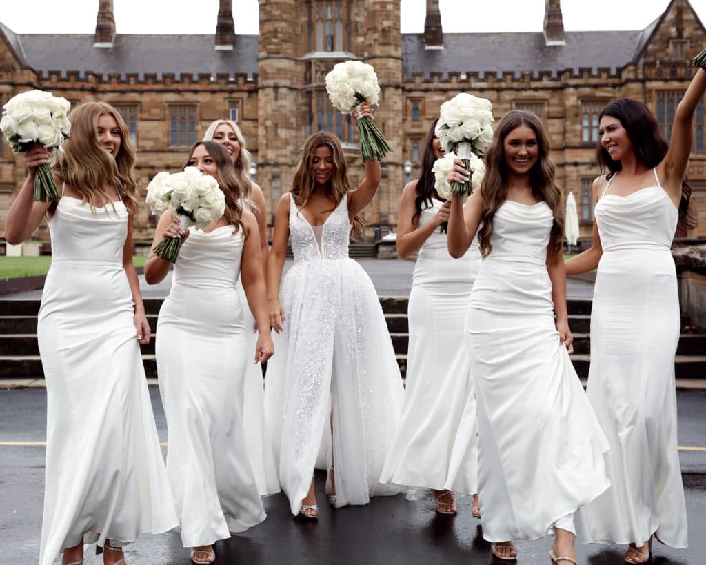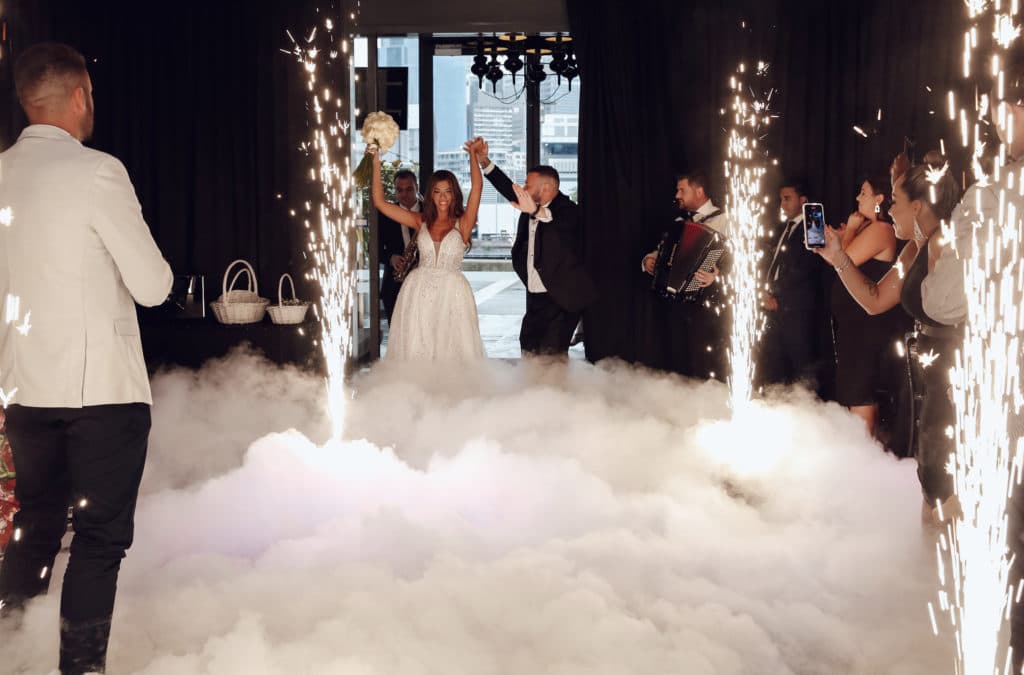 Photographer Image Haus Event Planner Kailey Kirk Wedding Dress Pallas Couture Hair @ombrehairandextensions Makeup- Jenny Do Flowers – @lflora Bridesmaid dresses- White Runway Suit Alex Goodman Venue Doltone House Pyrotechnics Sydney Fireworks