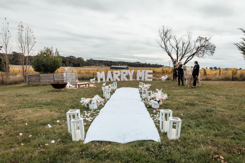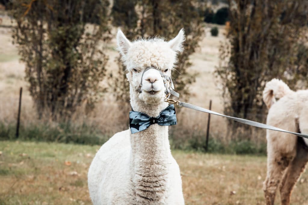 Alexander organised a romantic walk around the farm with two llamas/alpacas which led the couple on a track up a hill and back down. Melody heard one of her favourite love songs and saw a beautiful golden vine leaf field behind the set up, which left her absolutely speechless! At the end of the aisle were a llama and an alpaca with the cutest bow ties! It certainly was the most perfect moment.