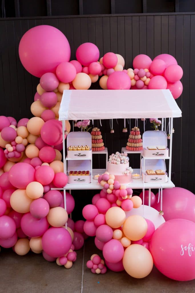 Think hues of pink all over the ever-cascading piles of balloons, flourishing blossoms and chocolate-coated strawberries. Because of the family’s love for travel, chic suitcases were overflowing with tasty desserts and stunning florals!