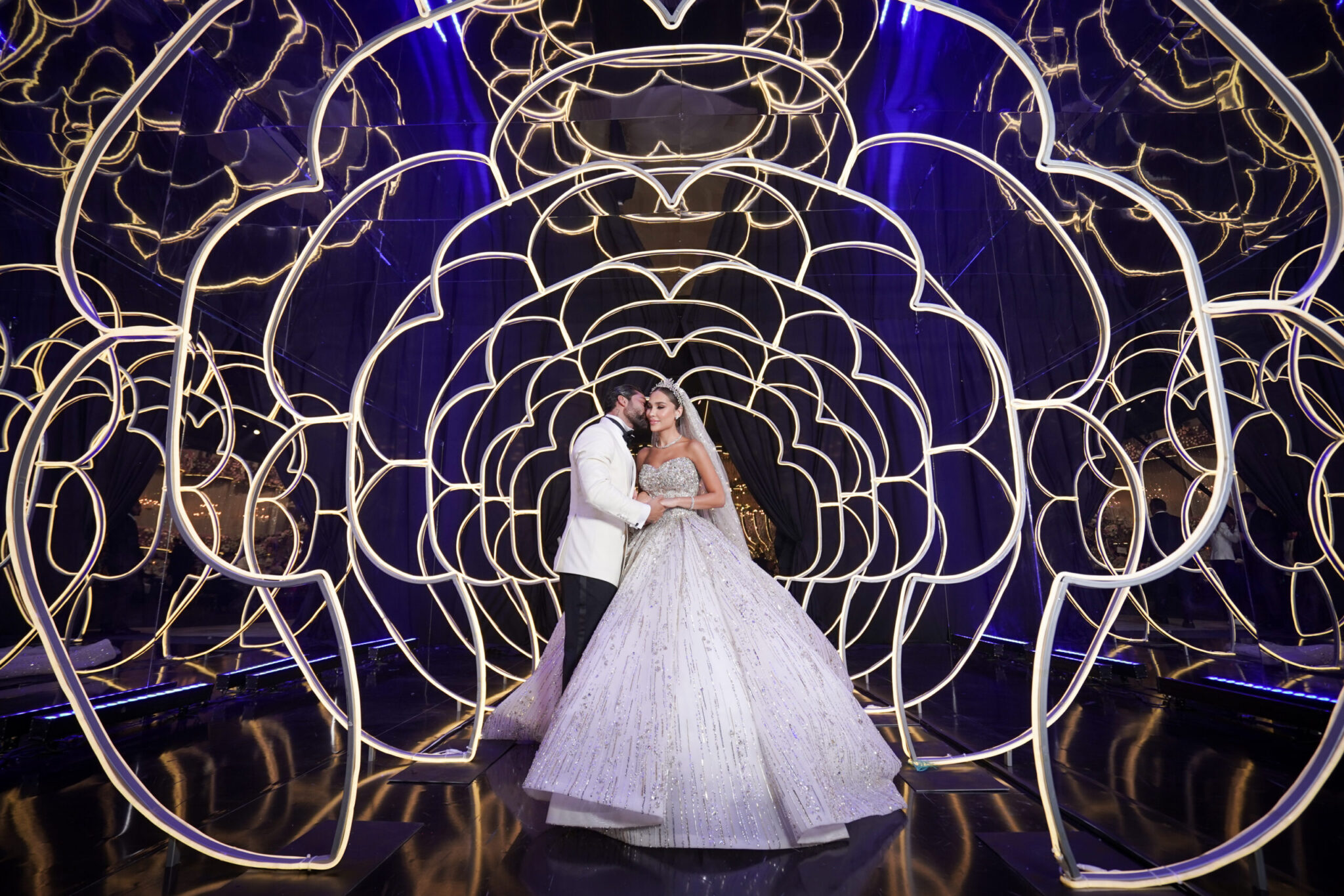 In the heart of Beirut, amidst the bustling cityscape, Diana and Yasin’s enchanting wedding day unfolded in a delightful blend of romance and elegance with a touch of royal flair. All The Details of Diana and Yasin’s Wedding The theme for their special day was a delightful mix of romance and regality, brought to life by a color palette dominated by rich purples and luxurious gold accents. The venue, the seaside arena in downtown Beirut, proved to be the perfect backdrop for their drea