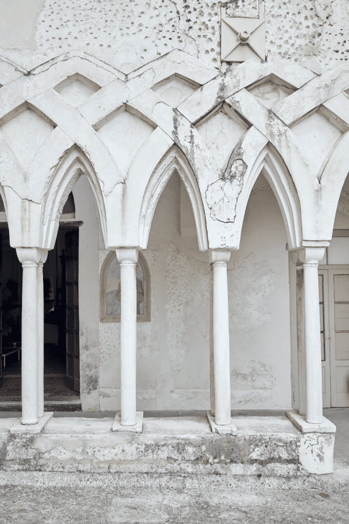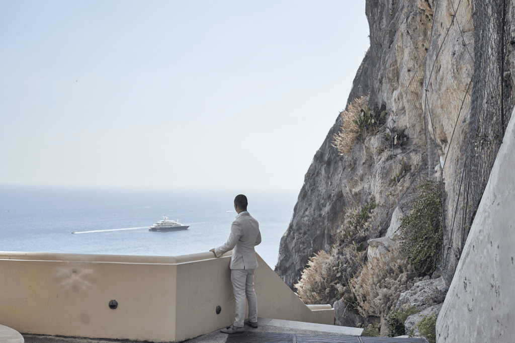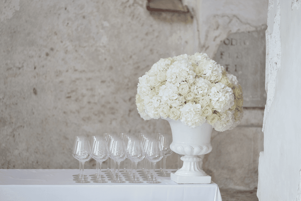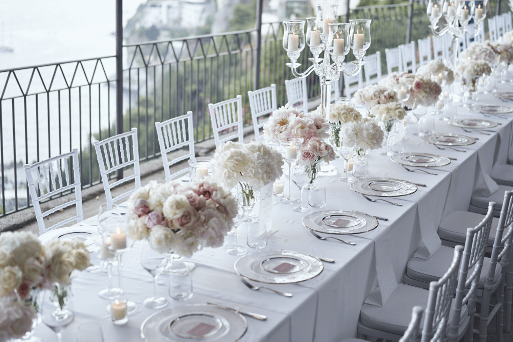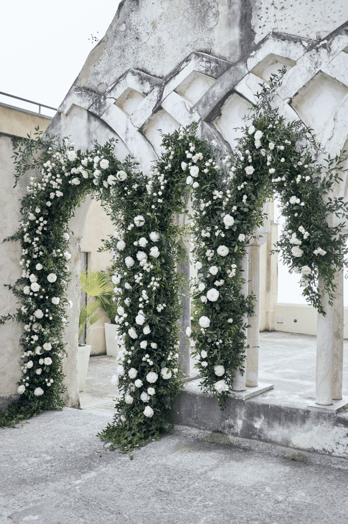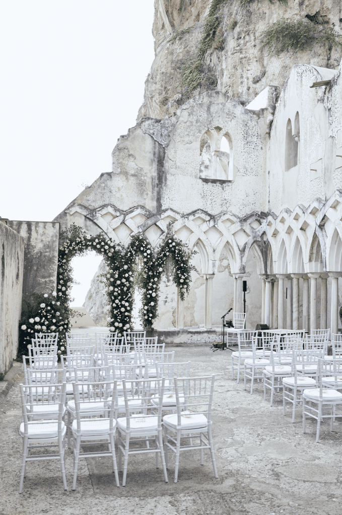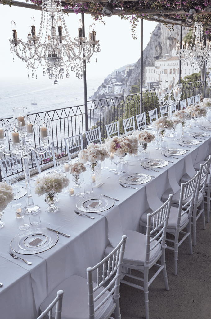 Their ceremony took place in a 13th century cloister, where the iconic medieval arches were lined with lush greenery and white floral arrangements that harmoniously complimented the Mediterranean setting. The reception followed on the belvedere terrace, under a canopy of pink bougainvillea flowers with glistening chandeliers. The table was lined with crystal candelabras, candles and hues of soft pink and white florals, creating a whimsical romantic ambiance as the sunset into the sea.
