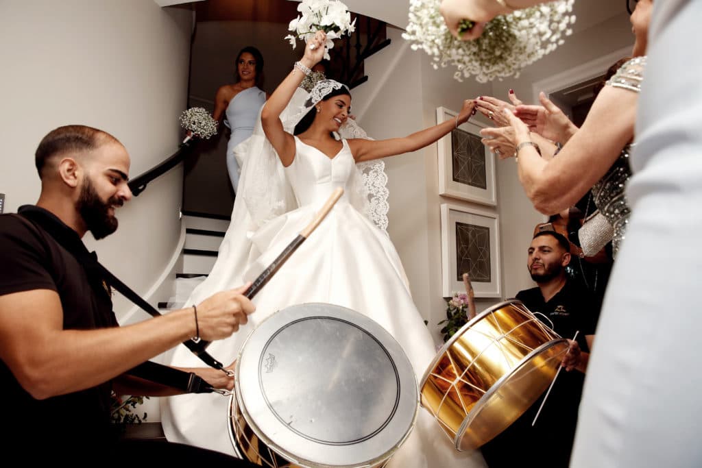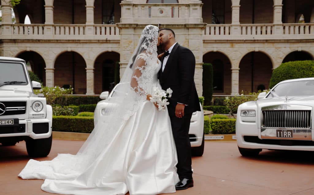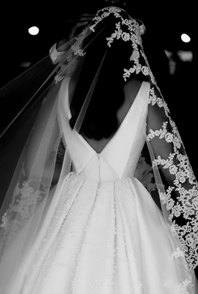 ‘Raquel wanted a unique but very simple gown, so I suggested we fully embellish the train with hand beaded pearls in 3 sizes for a textured dramatic back’, Dress Designer Steven Khalil told Wedded Wonderland. And was that gown unique! Paired with a stunning, lace-detailed Veil, this dress perfectly complemented the Bride’s figure, and amazed guests with the perfect attention to detail.