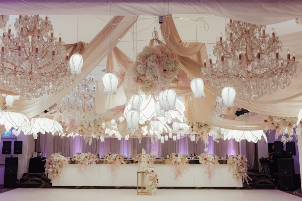 Adele envisioned a soft, subtle yet WOW design for her Wedding reception and her stylist Anna Wang nailed it! Grand Paradiso transformed into a pretty and delicate room, shades of blush and pinks adorned the room – see below the spectacular design!