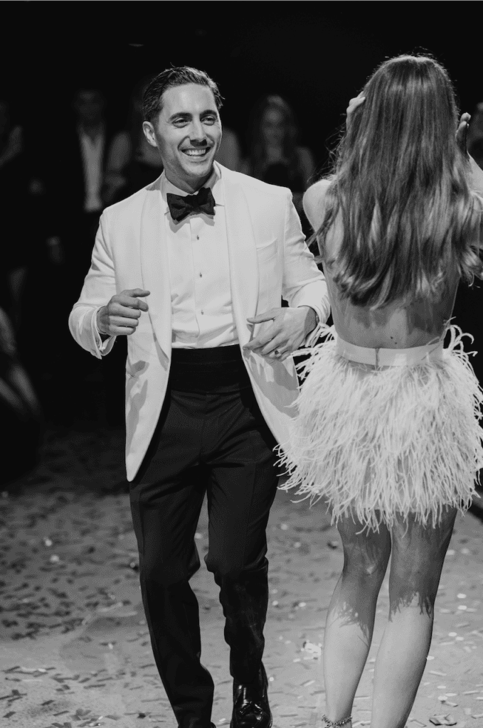 Both Claudia and John-Pierre changed their outfits for the reception with Claudia opting for a sexy feathered mini skirt, while John-Pierre changed into sleek ivory linen and wool blend dinner jacket to party the night away!