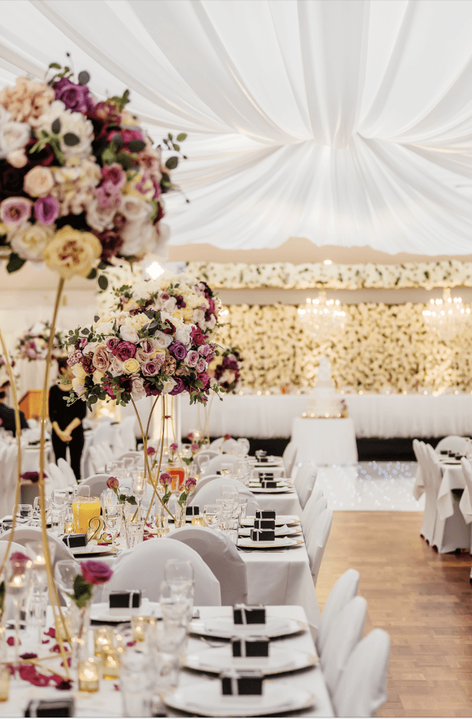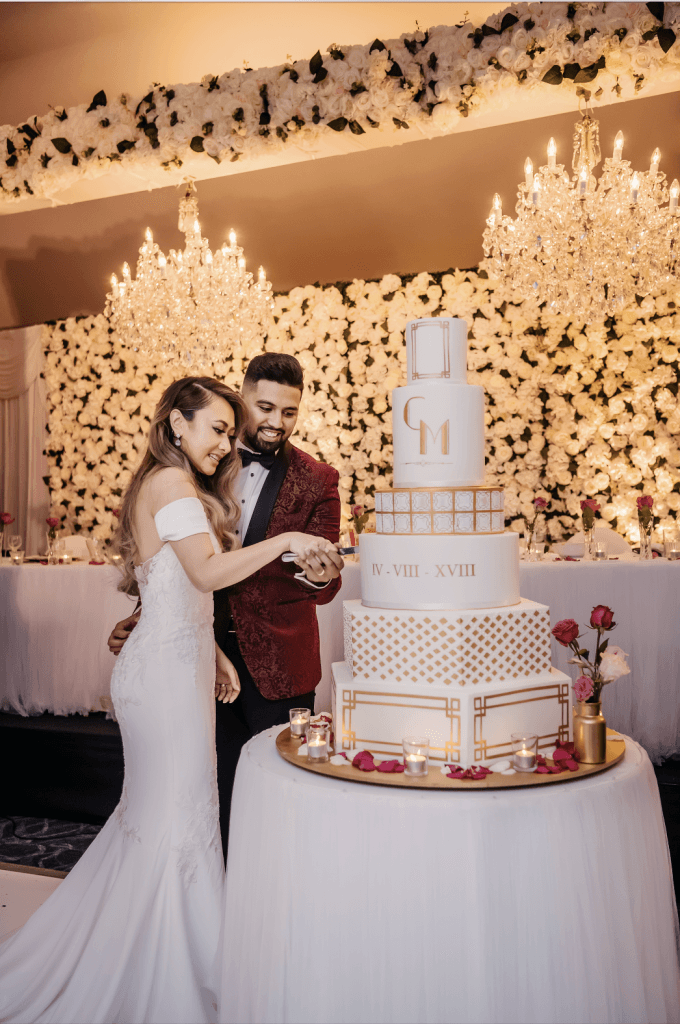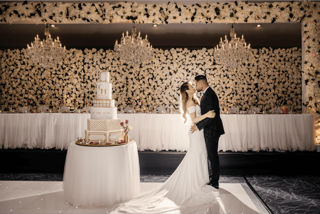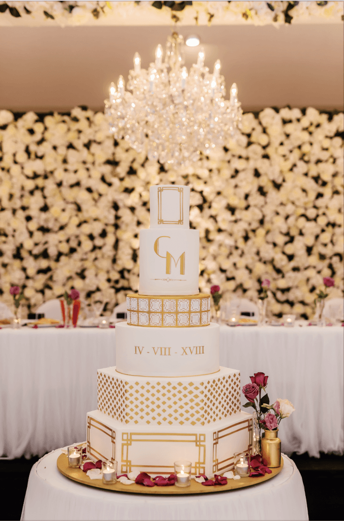 The reception was adorned with a stunning floral wall, beautiful chandeliers and a six tiered wedding cake.