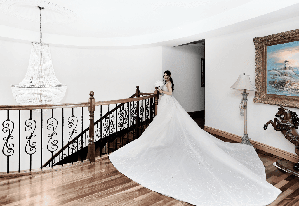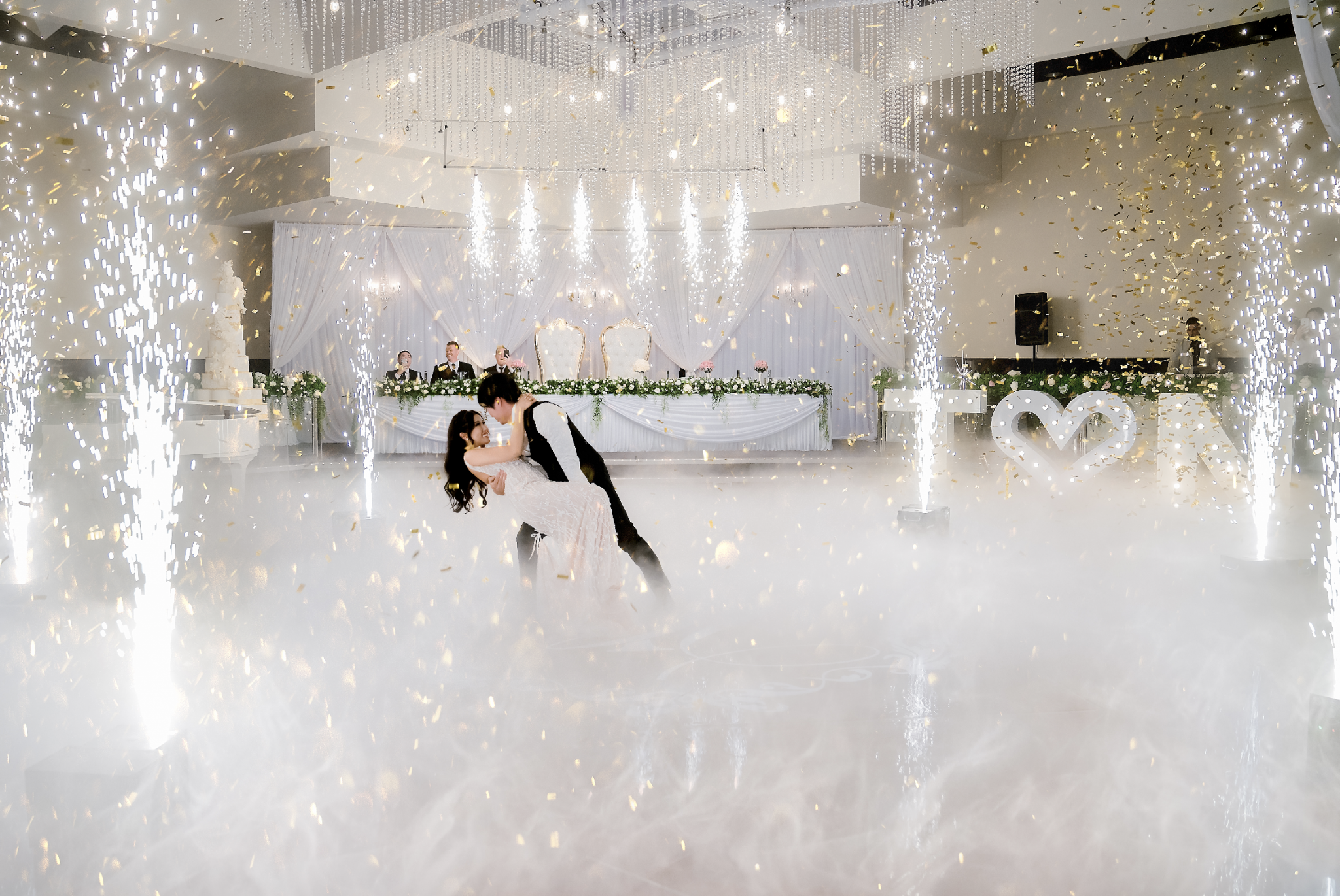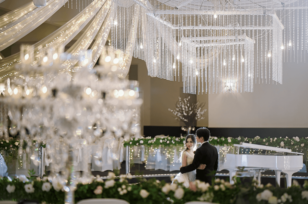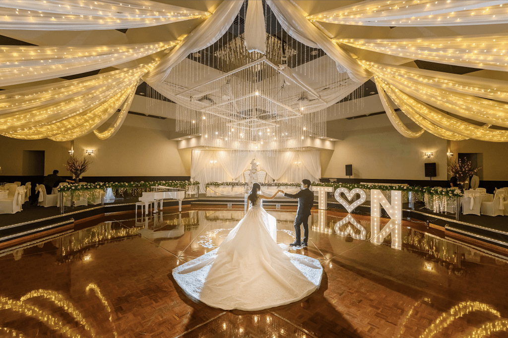 The couple’s wedding featured a white and gold colour scheme with touches of modern simplicity. Fairy lights and draping adorned the ceiling creating a magical and dreamy ambience.
