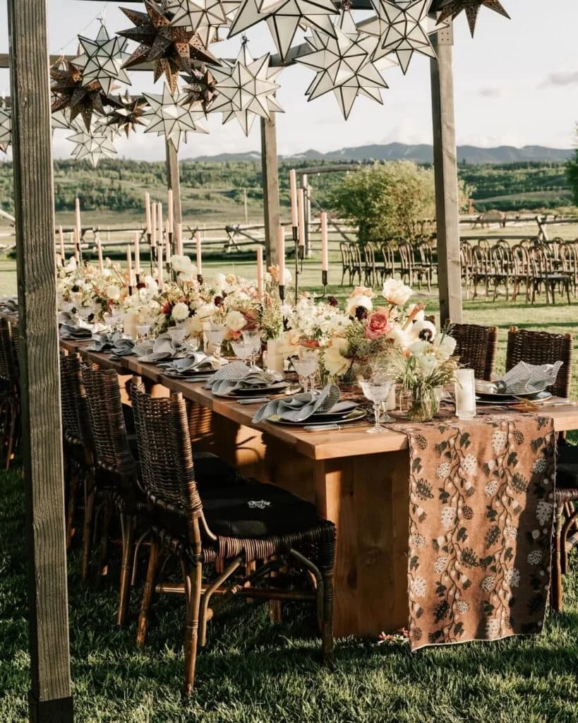 Rustic doesn’t mean rough anymore. Think textured linens, warm metals like gold and brass, dramatic florals, sculptural greenery, and soft drapery alongside original wood. These elements turn rustic into refined.