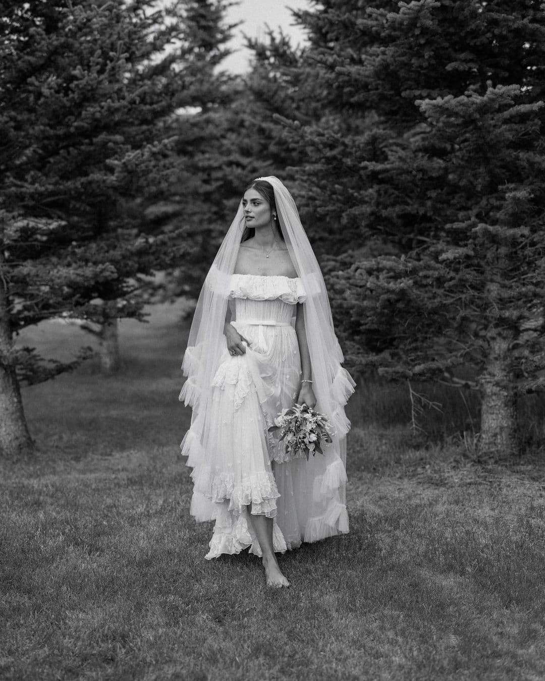 American model and former Victoria’s Secret Angel Taylor Hill wed Daniel Fryer, a private equity investor, in her hometown of Colorado on June 10. The beautiful bride wore a custom-made gown by the Italian fashion house ETRO, for whom she had modeled for years. The off-shoulder creation features a high waist cut tightened with a ribbon belt, and a dainty tiered skirt with lace frills.