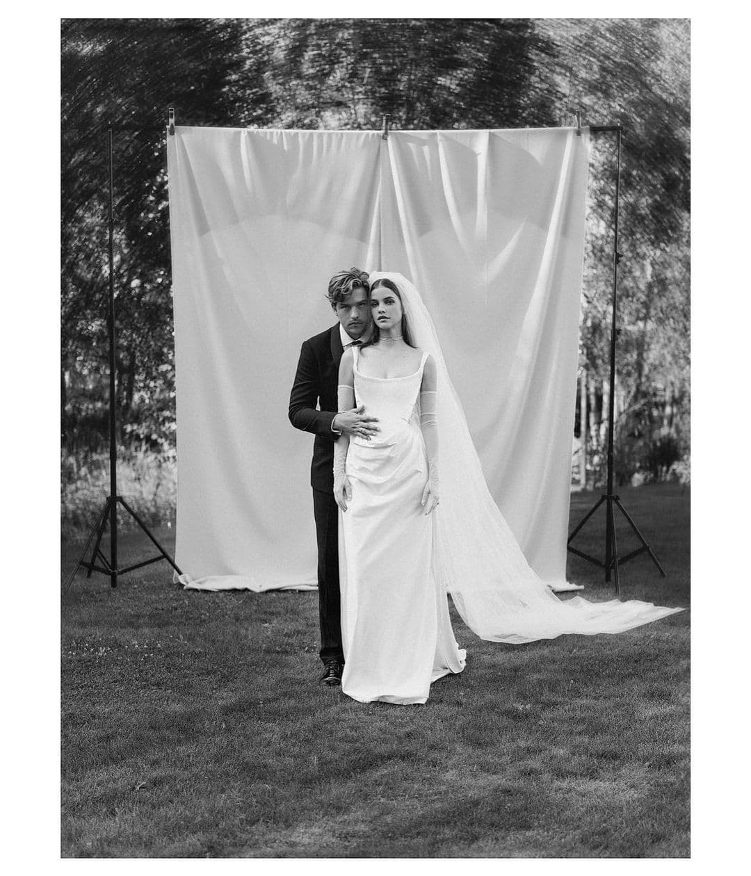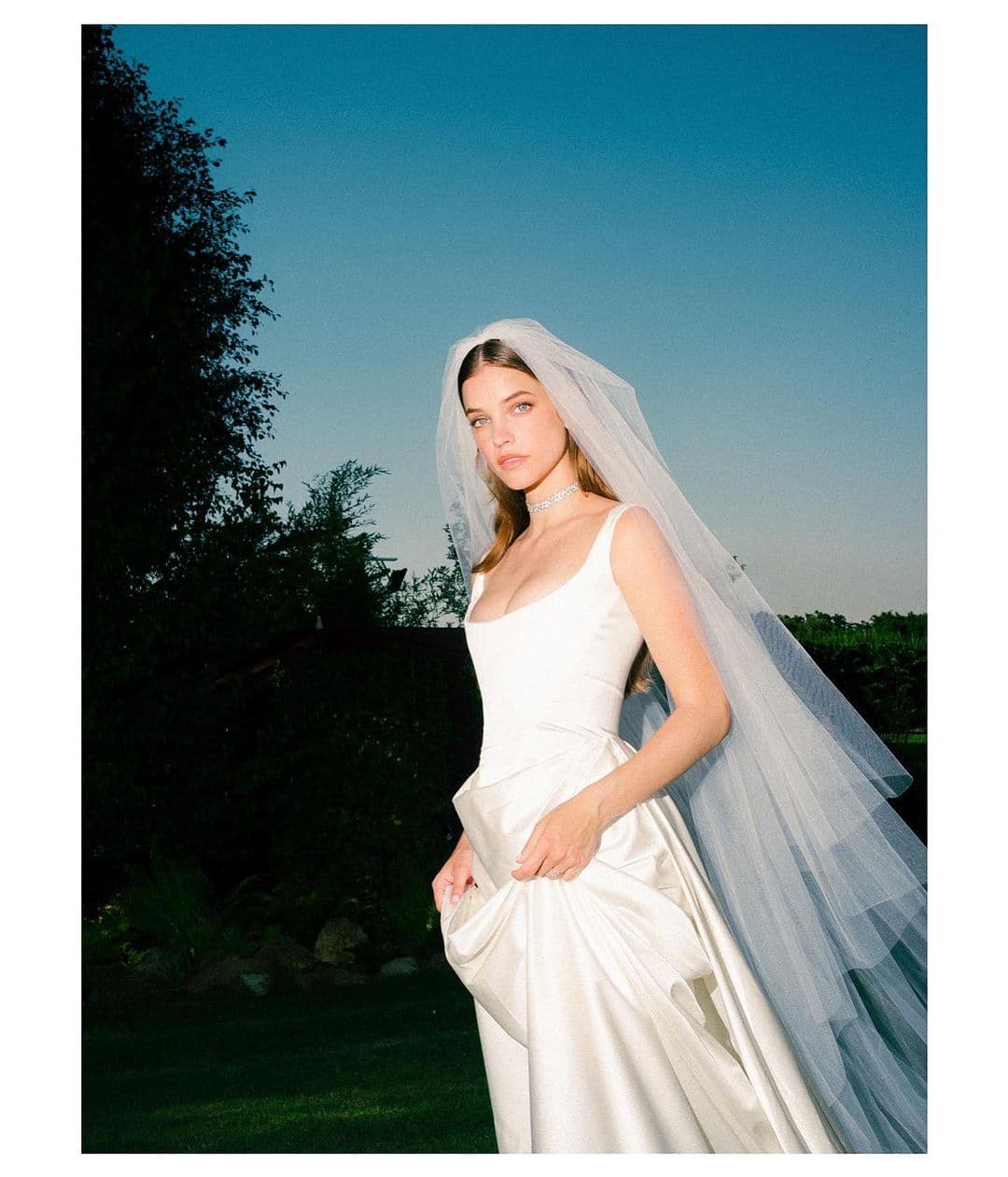 For her charming countryside wedding to Suite Life of Zack and Cody star Dylan Sprouse, Barbara Palvin returned to her home country of Budapest. She wore an elegant Vivienne Westwood gown with a wide u-neckline, corset bodice, and subtle draped skirt. In several snaps, she wore a sheer pair of gloves reminiscent of the 1960s. Even with its lack of embellishments, the frock held the sophistication of a classic wedding dress, owing to its perfect fit and soft silhouette.