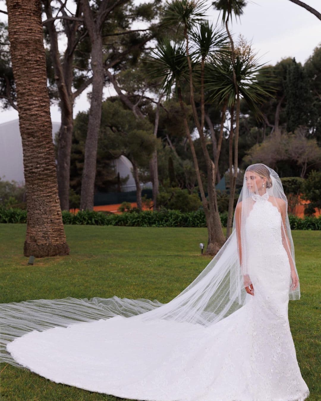 Singer Lionel Richie’s youngest daughter Sofia recently wed music executive Elliot Grainge in a grand destination wedding in Antibes, southern France. Sofia, who is a social media star and model, wore a bespoke lace halter gown with a choker detail from Chanel. The exquisite bridal look was marked by a cathedral-length train and a trumpet silhouette, which perfectly matched the grandeur of the couple’s getaway wedding.