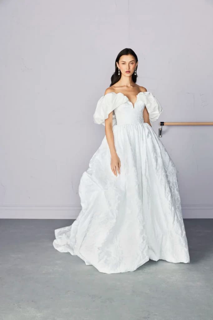 For brides who want Bridgerton romance with a bold, couture edge, her lace-forward gowns offer just that.