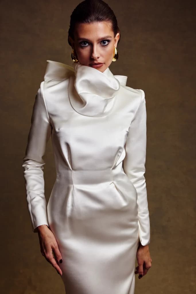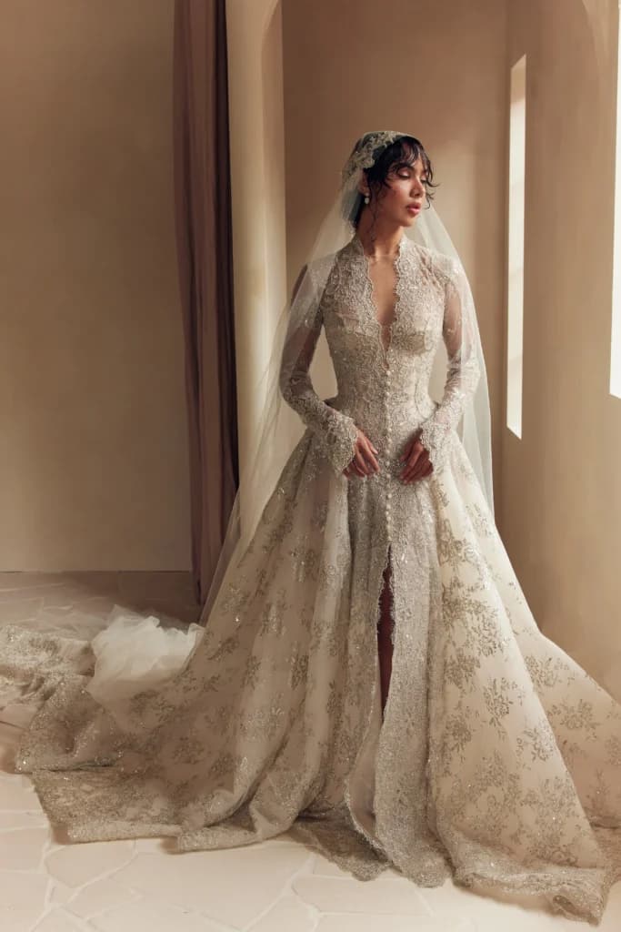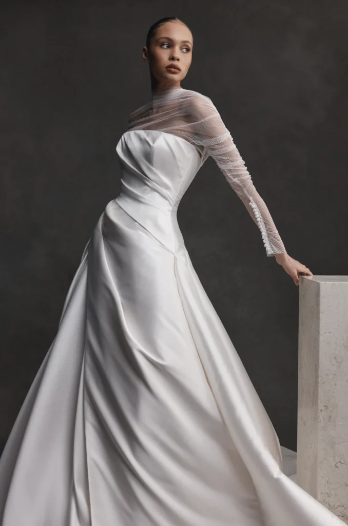 Lillian Khallouf designs wedding dresses celebrated for their refined tailoring, sculpted bodices, and luxurious silk or satin finishes, giving brides a confident, contemporary elegance with a subtle nod to regal sophistication