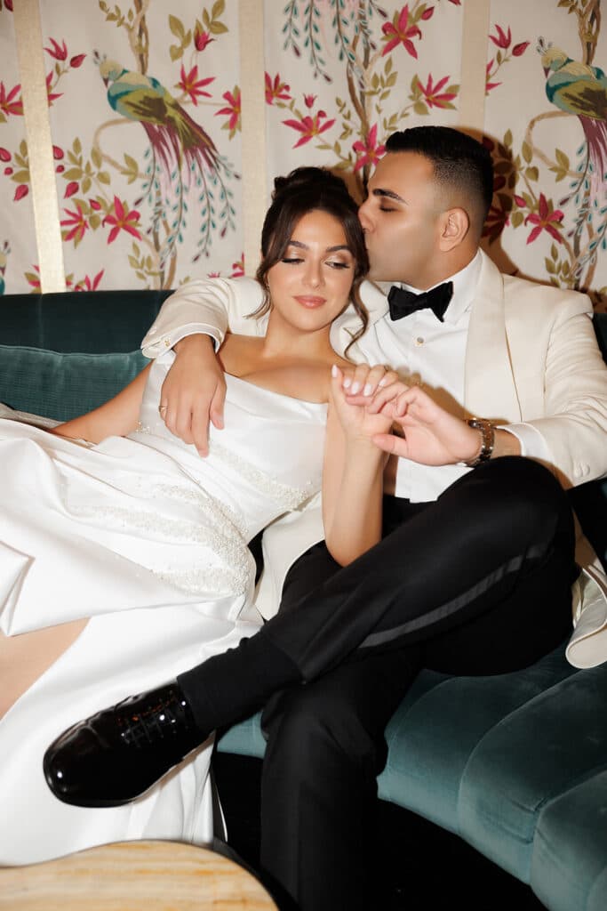 Stephanie and James focused on entertainment and good food rather than extravagant florals and styling. Their entrance with Zaffet Lebnen on the drums and a performance by the talented singer Jacinta set an energetic tone. Lefemme, a girl group, and Jacinta with her crew from Saints Sound Entertainment ensured the night’s entertainment was memorable. Personalized details, such as floral arrangements designed by Stephanie’s mum and made by her dad, added a unique touch. The wedding reflected their personalities, from the suits and dress to the food and the thoughtful detail of personalized thongs for dancing.