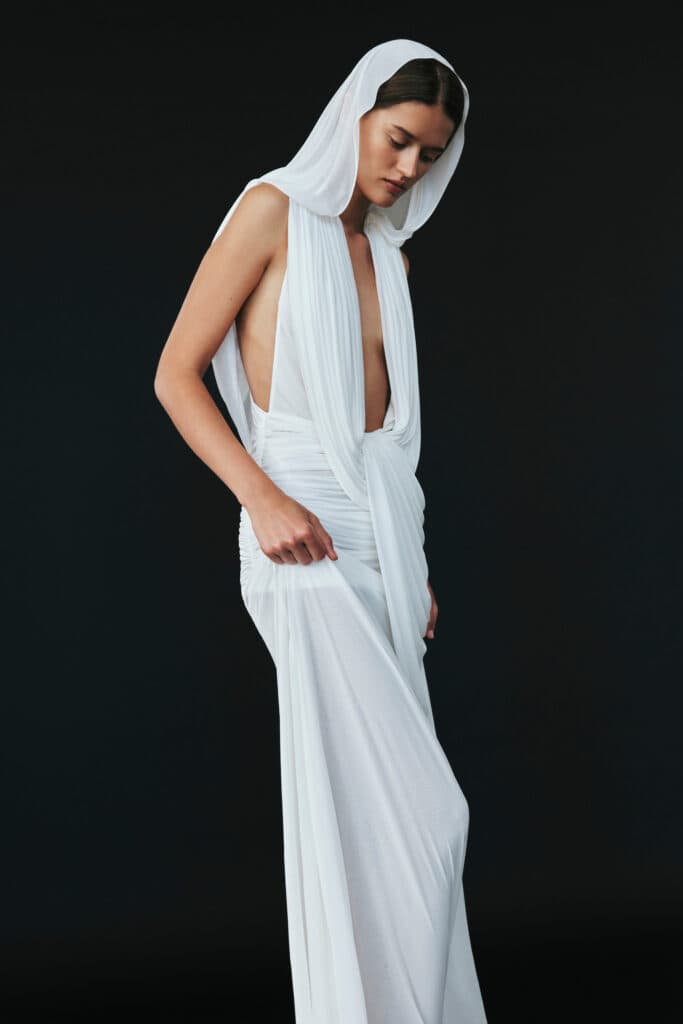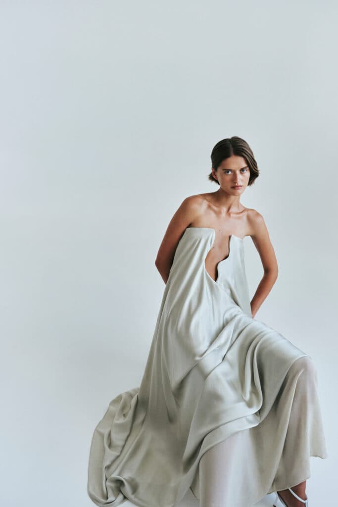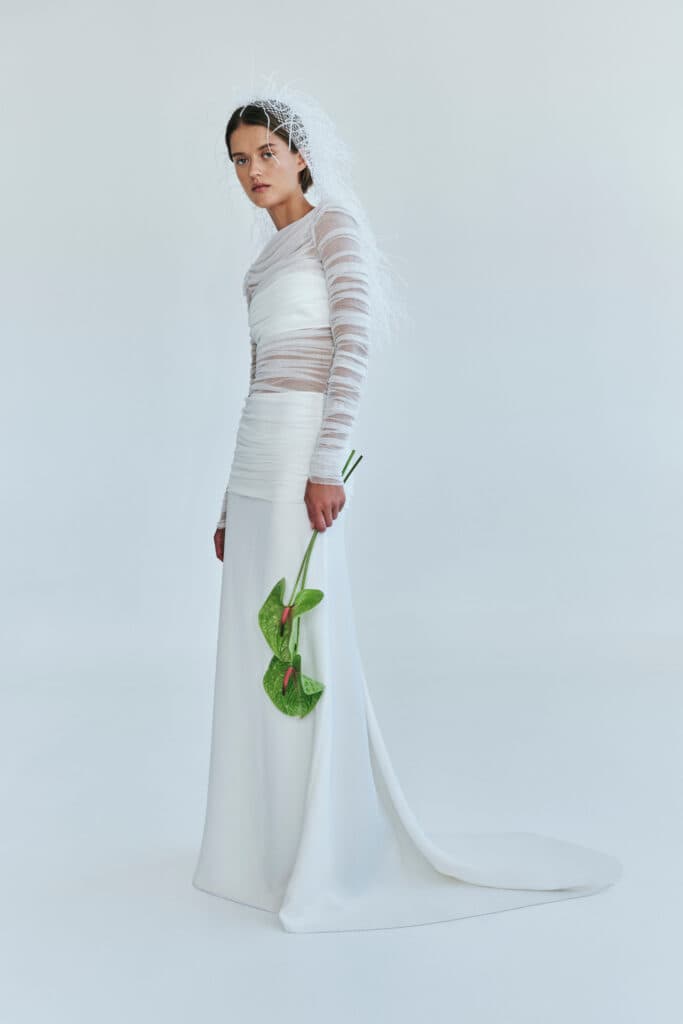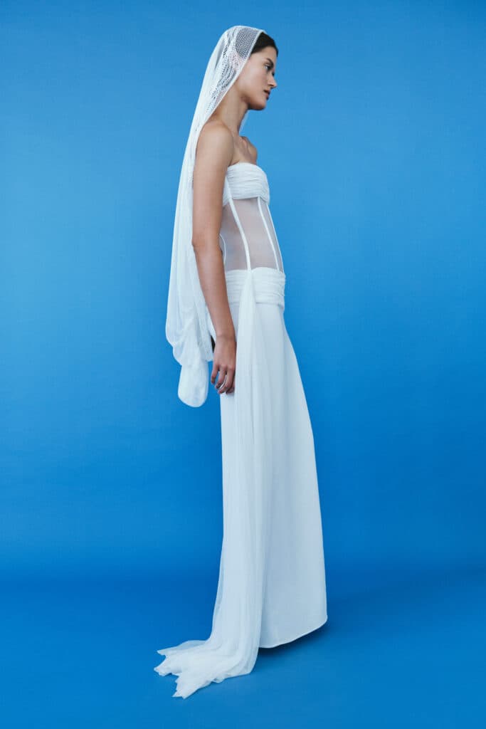 From structured, transparent bodices to soft ruched silk and short-hemline mini dresses, the collection traverses a spectrum of it-girl bridal attitudes, seamlessly transitioning from the aisle to the after-party and beyond. Esber emphasizes this versatility: “The collection is an evolution of our signature silhouettes, reimagined for a modern bride. [It is] as relevant for a traditional ceremony or courthouse vows, as it is for a beachside wedding. And, taking a ready-to-wear approach means the investment isn’t limited to one-time wear.”