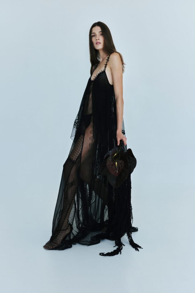 Drawing on an interplay of structure, Esber’s latest offering merges classic tailoring with fluid forms and unexpected textures like feather-embellished gowns, layered lace, and dramatic Grecian draping evoking old-world glamour.