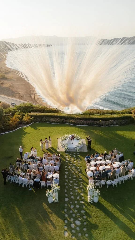The ceremony was held on a circular white platform, with lush, low-lying florals framing the space, creating a sense of closeness without obstructing the horizon. Sculptural floral installations enhanced the natural beauty of the venue, adding texture and dimension while maintaining the focus on the breath-taking views. As the sun set, the landscape transformed, bathing the venue in warm, soft light. The final touch? A surprise fireworks display that erupted over the coastline, leaving guests in awe of the cinematic spectacle.