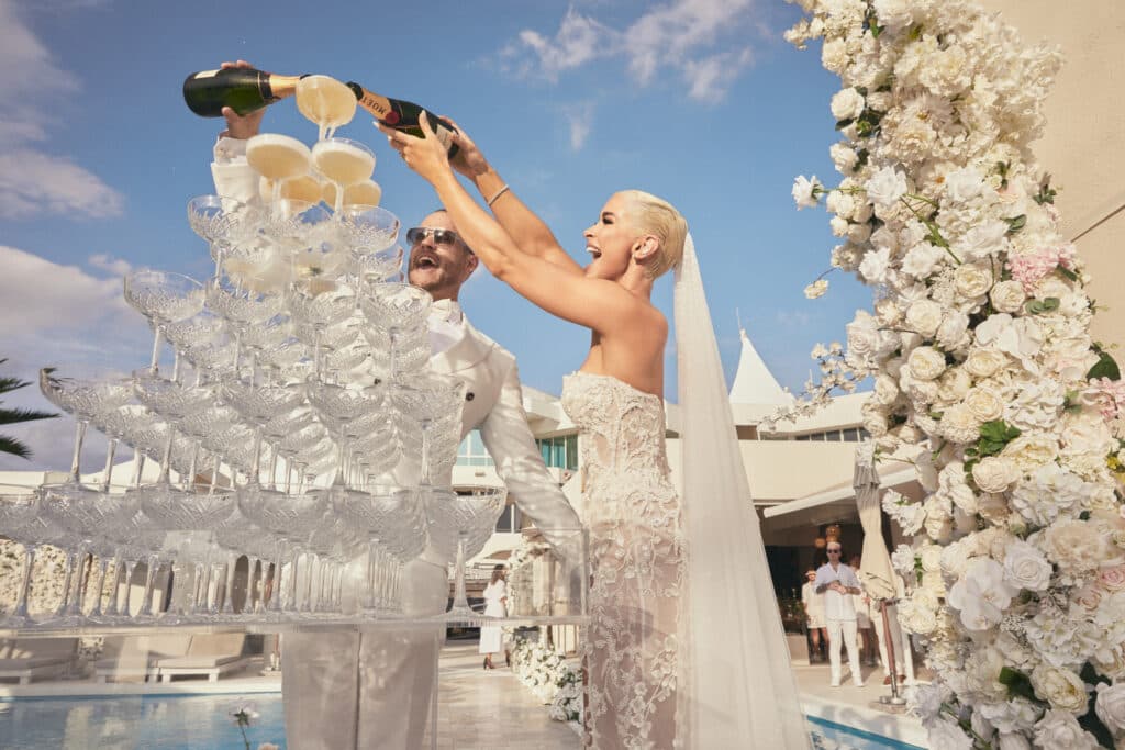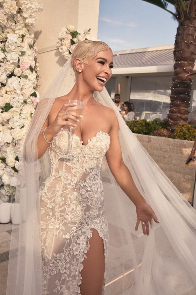 Alysia Bridger, the mastermind behind the couple’s big day, brought their vision to life with meticulous attention to detail. The picturesque La Luna, a floating beach club with a breathtaking view of the marina, served as the idyllic setting for the ceremony. Ellie’s dress was a masterpiece, crafted by designer Sam Oglialoro and stylist Paul Versace. The trio designed three dresses that not only complemented Ellie’s skin tone but also captured the essence of the Mediterranean-inspired theme. Her long-sleeved gown, complete with an illusion neckline, a dramatic train, and floral appliques, was a show-stopper. The 1920s-inspired capped veil, adorned with delicate petals, added to her overall goddess-like appearance, making for a truly unforgettable bridal look.
