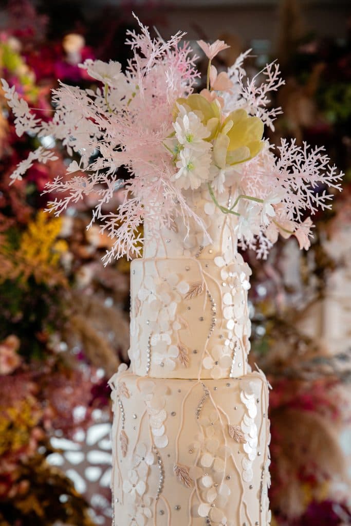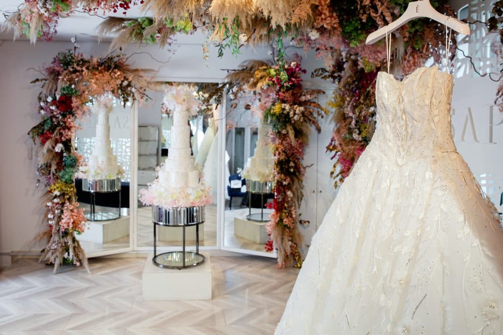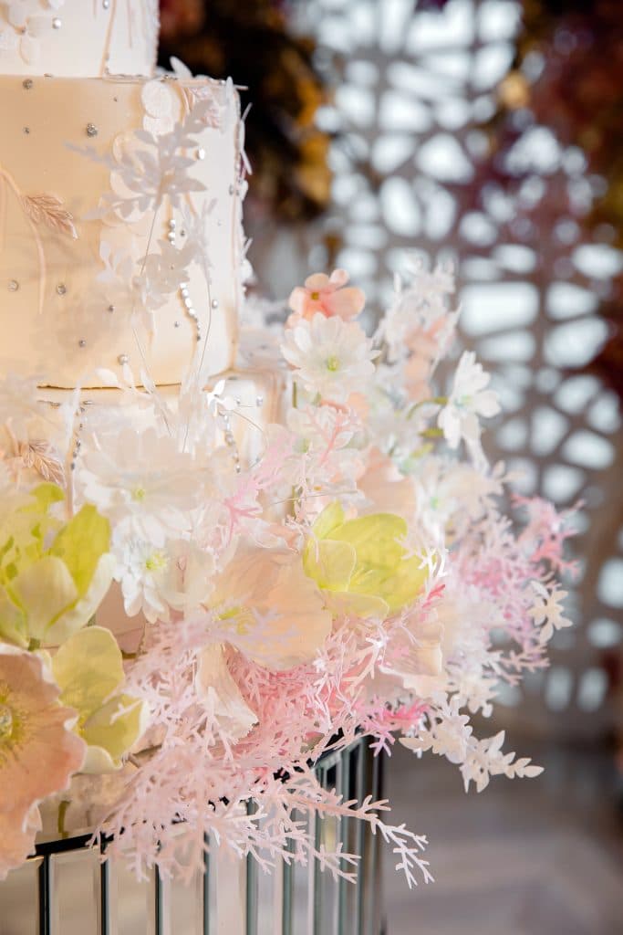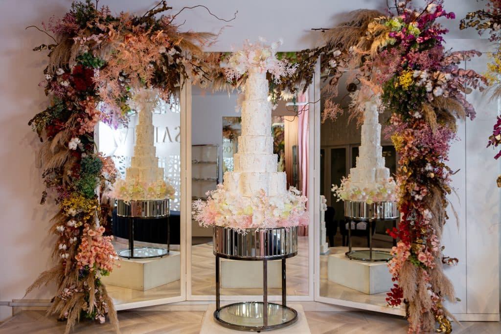 The 7-tier towering cake looked incredible with floral details all throughout, and featured a romantic arrangement of yellow, pink and white blooms on the top and bottom of it. The gown-of-inspiration was hung nearby, and truly emphasised the resemblance of the two pieces.