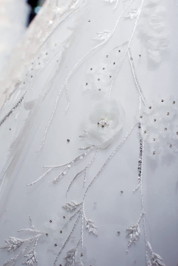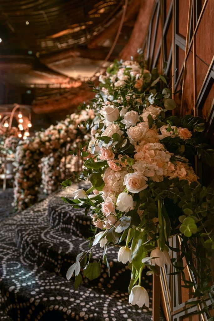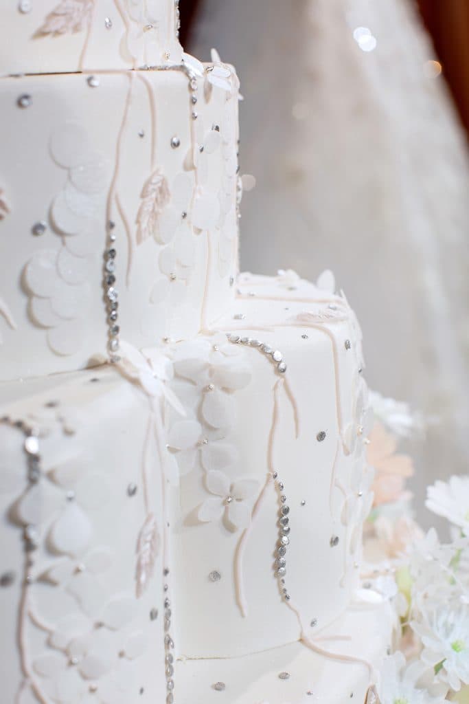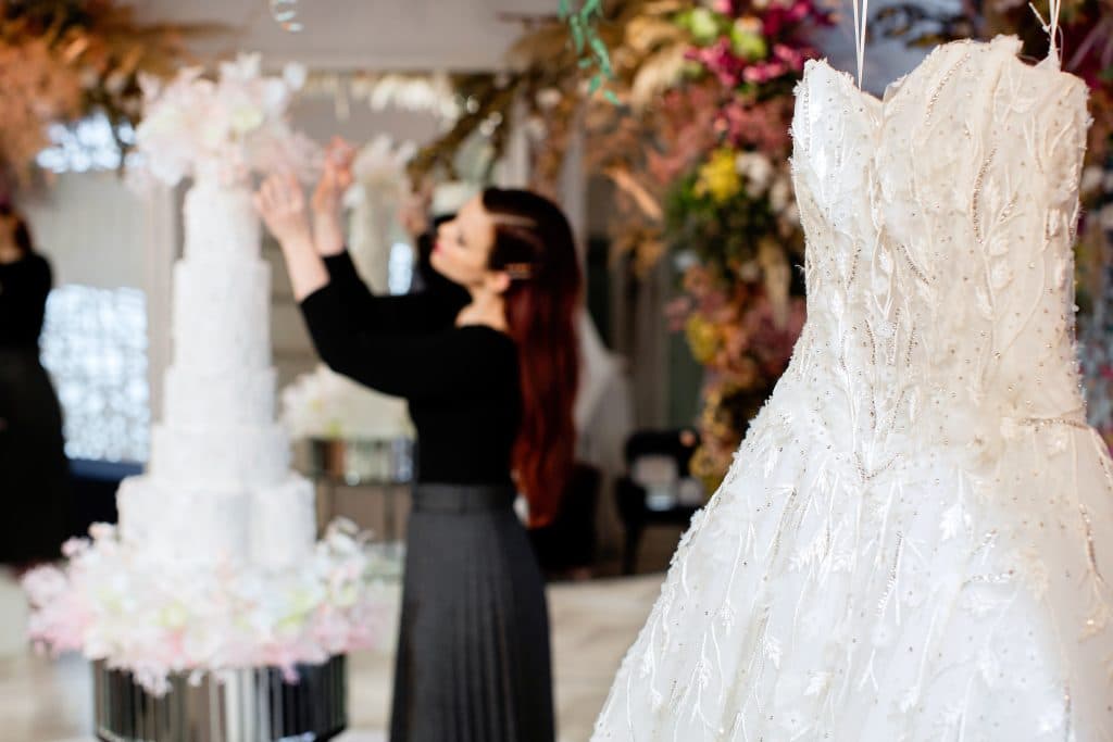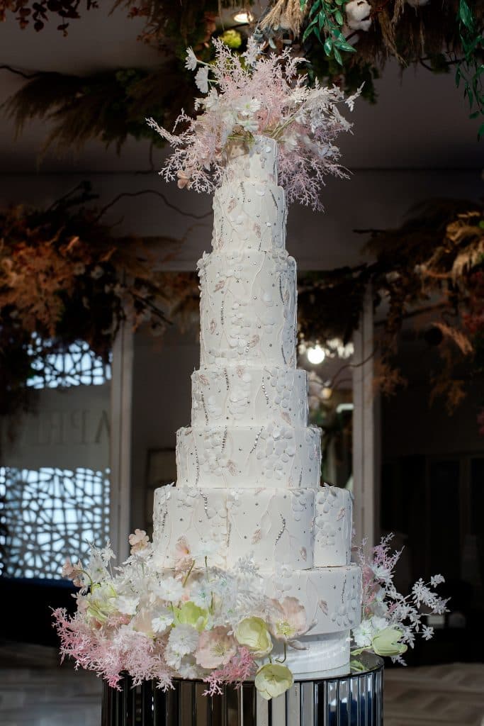 The 7-tier towering cake looked incredible with floral details all throughout, and featured a romantic arrangement of yellow, pink and white blooms on the top and bottom of it. The gown-of-inspiration was hung nearby, and truly emphasised the resemblance of the two pieces.