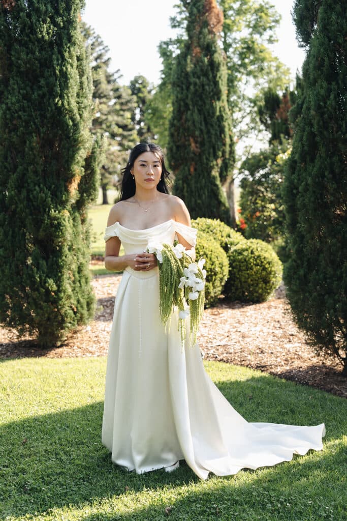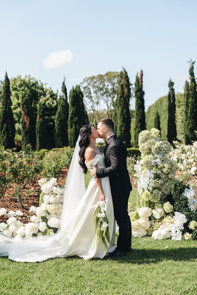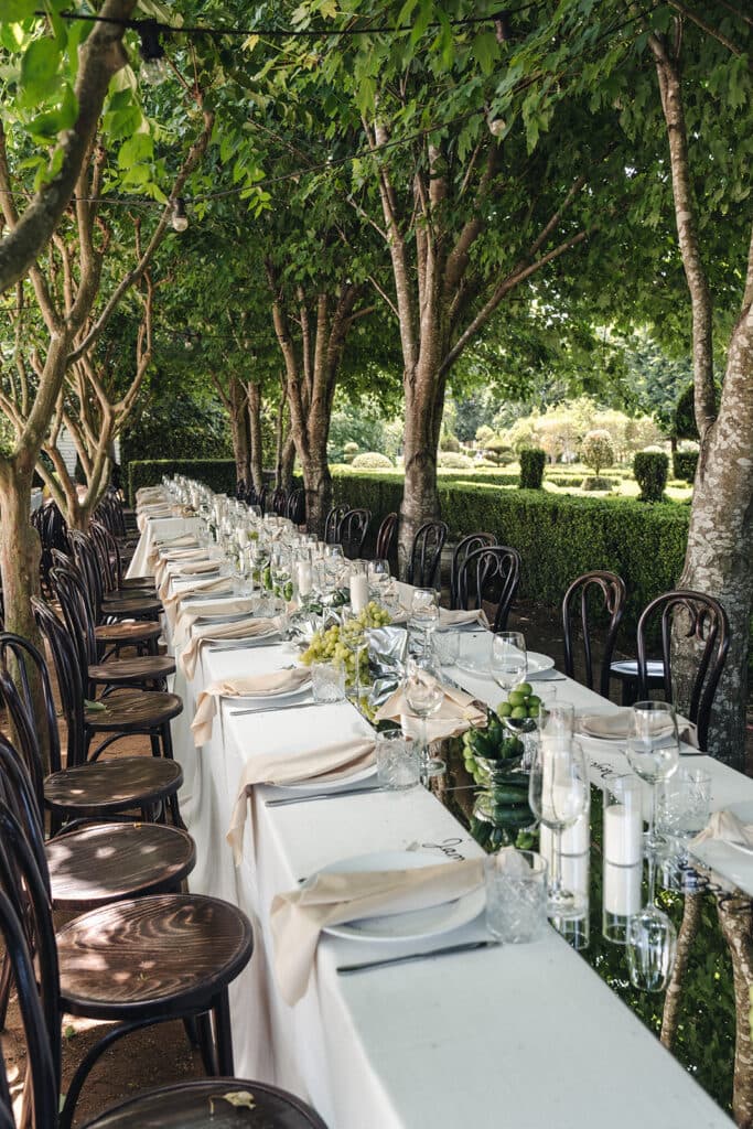 The gorgeous gardens at The Merribee in New South Wales served as the backdrop for the occasion, where sprawling gardens were outfitted with banquet tables, fairy lights, and relaxed outdoor seating. Given the bride’s vision of an “intimate, elegant dinner soirée, it’s safe to say that it was executed perfectly, down to the finest detail.