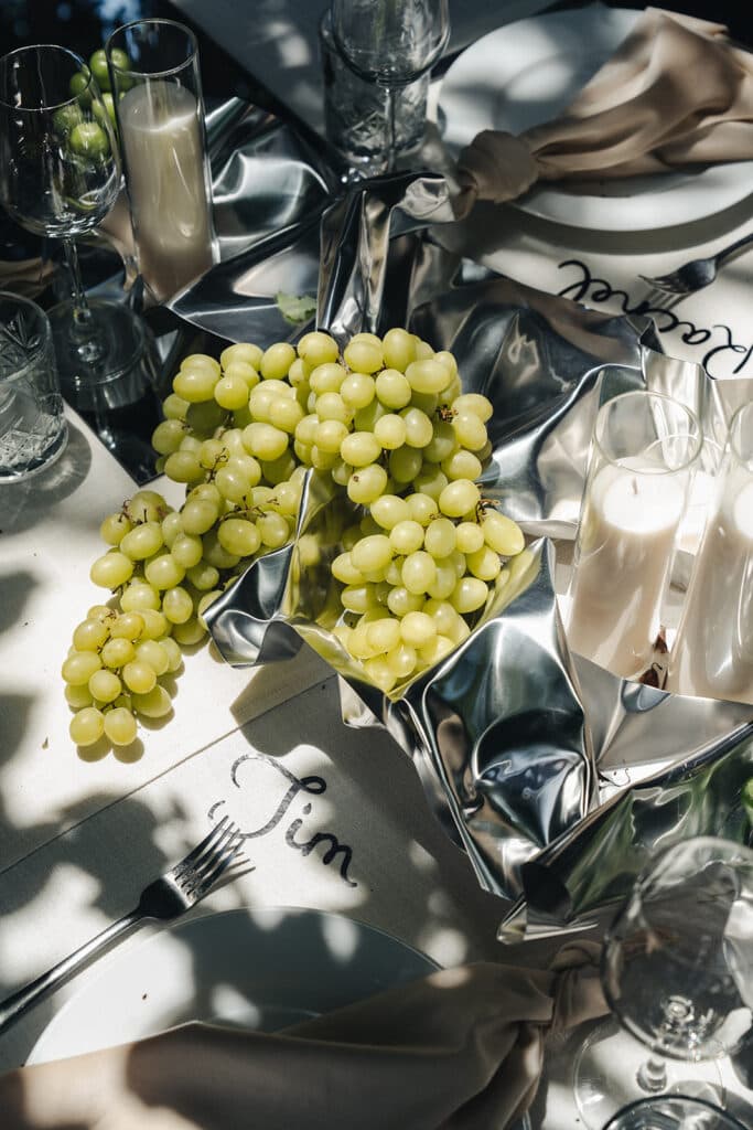 As for the rest of the outdoor space, she explains, “I wanted the florals to match the surroundings and blend in like they were already a part of the garden.” As a result, dinner tables were covered with mirrors, candles, name decals, seasonal fruit, wine bottles, and crystal glasses, all evoking a classy dinner party.