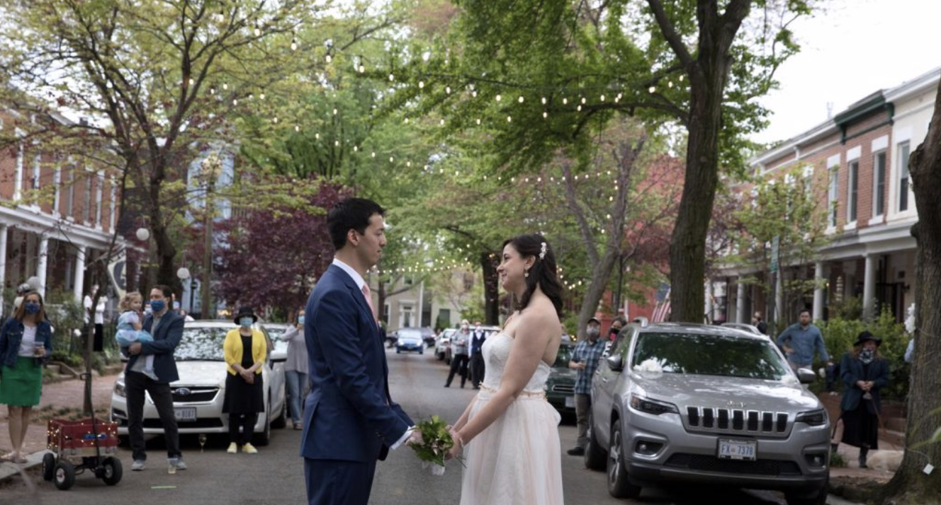 An hour before she was to marry her fiancé, Amanda Mason walked out of her house in a white lace jumpsuit and peach tulle skirt, to find chalk drawing of hearts along the sidewalk… Yep, the neighbours had joined forces! Source Across the street, Scott Davis acted as a one-man street sweeper, raking leaves from the gutter into a large paper bag and bringing plants from his home to help the couple create a wedding altar. A few doors down, teenager Isabel Rebora had a friend to hoist h