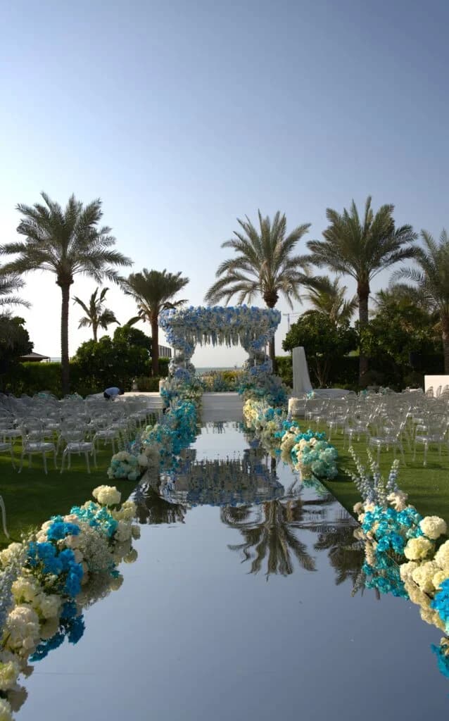 The following day, October 18th, was nothing short of dreamy. The serene Dana Garden at Four Seasons Resort Dubai was transformed into a floral wonderland. The soft hues of blue, white, and green combined with the lush florals and a live violin performance to create a breathtakingly romantic atmosphere. As Shifa made her grand entrance down a mirrored aisle, she was an image of grace, surrounded by the soft beauty of nature and a sense of serenity that had every guest captivated.