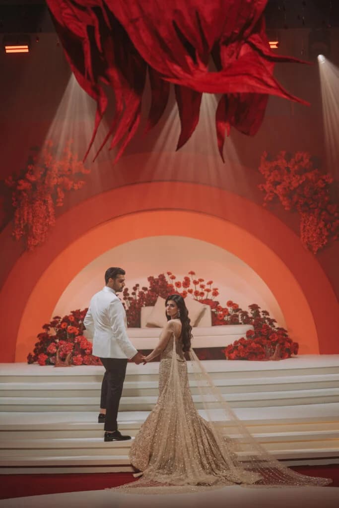 The final day of celebrations, October 19th was an absolute showstopper. The iconic Atlantis The Royal was the venue for the grand reception, and it did not disappoint. Guests were ushered into an art installation-like ballroom, where a handcrafted fluid fabric structure draped the ceiling and cascaded flowers and crystals created an otherworldly ambiance. The grand entrance was nothing short of dramatic, with the couple unveiling a four-tier floral cake that descended from the ceiling to gasps of awe.