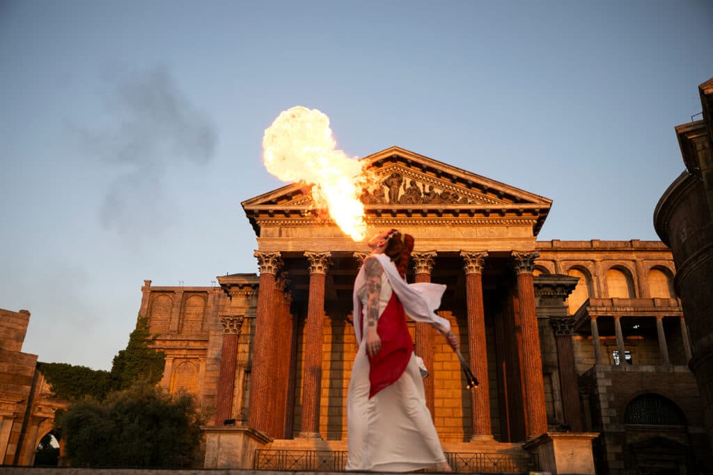 When the couple and their families arrived at the venue, they were greeted with a spectacle that felt like a scene straight out of a Roman epic. The entrance alone was a showstopper: Roman soldiers lined the path, Roman music echoed in the air, and fire eaters lit up the night. Guests were welcomed with themed drinks and transported into a world where every detail, from the lighting to the performances was inspired by the Roman Empire.