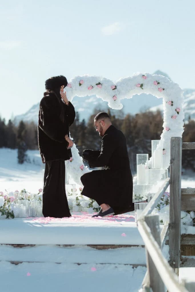 Simone, completely unaware of what was coming, thought they were simply going out for an elegant dinner. Little did she know, the evening would be far more magical than anything she could have imagined. A romantic horse-drawn carriage, arranged through the legendary Badrutt’s Palace, picked them up, delivering them to the hidden pier of Lej da Staz. The scene that awaited Simone was something straight out of a fairytale, a private world of soft snow, delicate flowers, and a love that felt infinite.