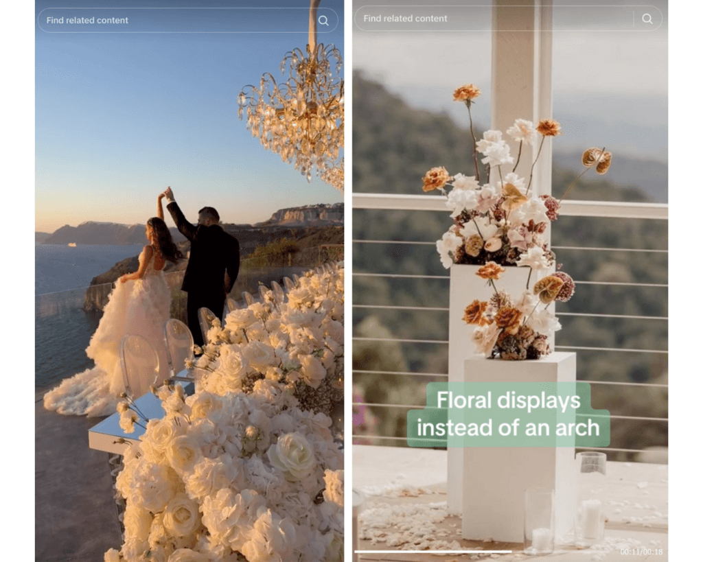For example, a quick search on “weddings” will show fairytale venues and otherworldly destinations, with many showing how beautiful it is to get married in Italy. By romanticizing this country, this may lead brides to neglect other options and be fixated on European nuptials. One will also find a bevy of videos featuring “content trends” that suggest poses and transitions. Case in point, hiring a content creator for the big day has even become the new norm.