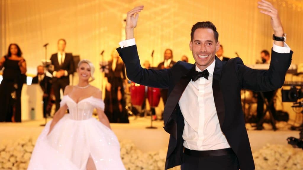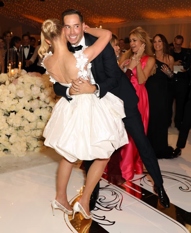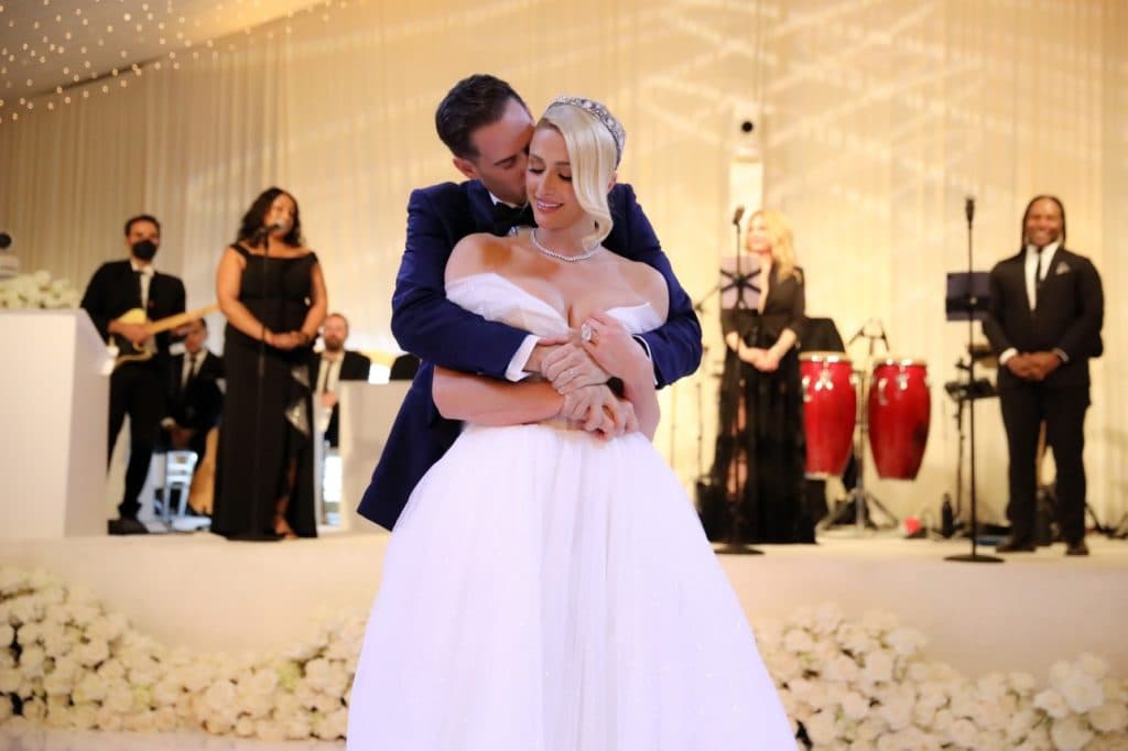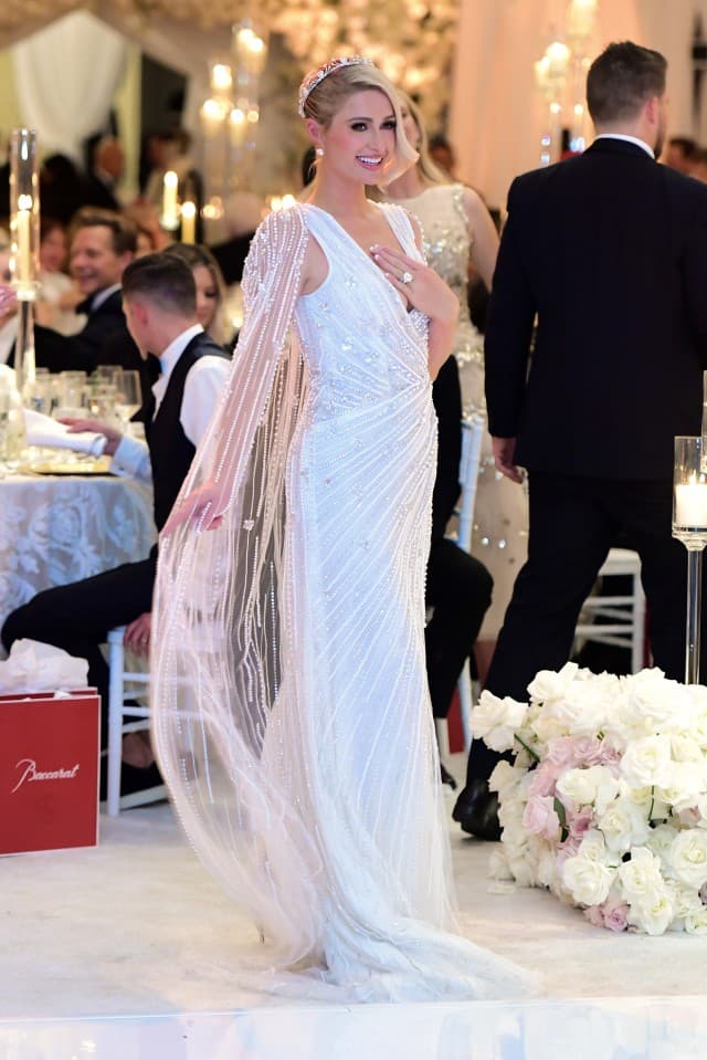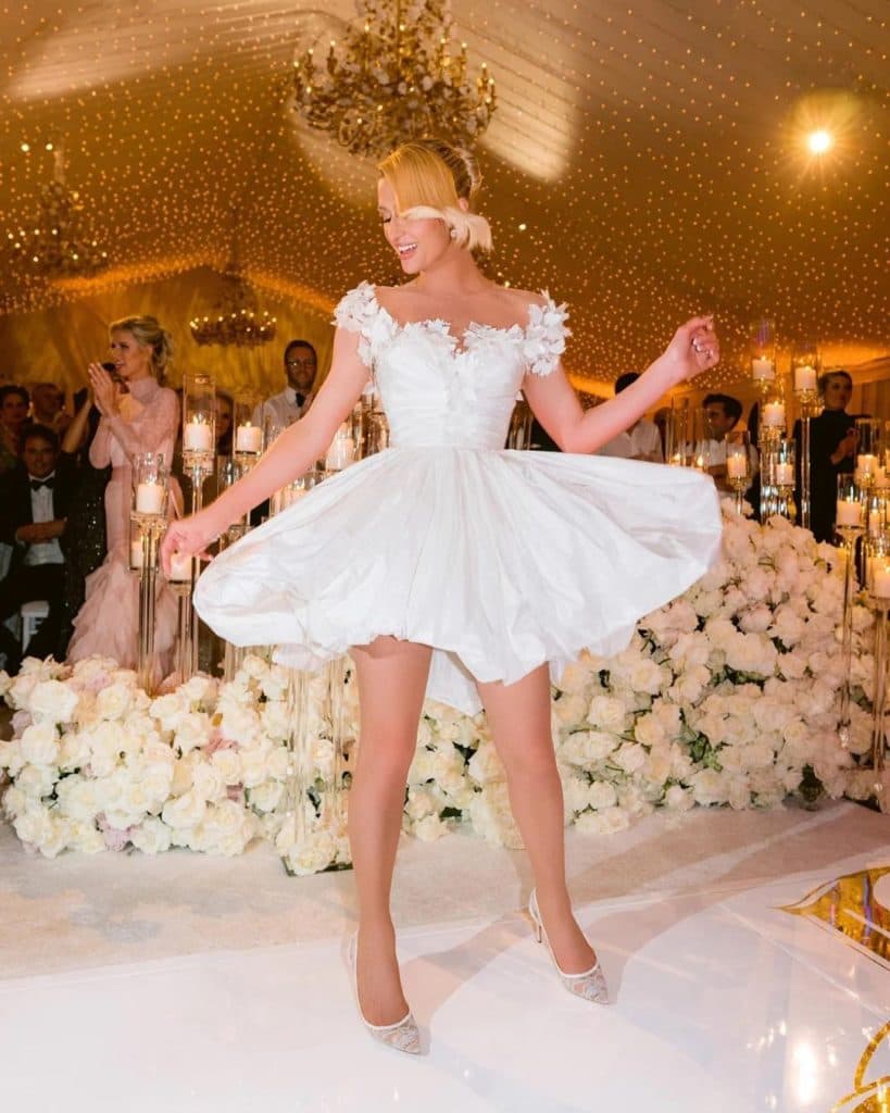 For the Couple’s first dance, Paris changed into a beautiful off-the shoulder custom Ghalia Lahav princess gown, complete with a sparkling crown. Paris also sported a crystal-covered Pamella Roland custom gown complete with a cape. and ended the night dancing in a custom, short Oscar de la Renta dress.