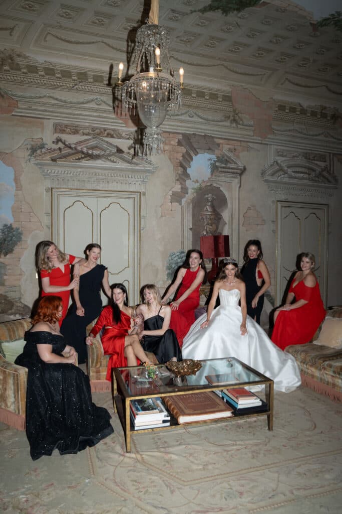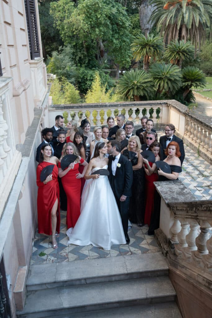 Directed by the bride’s bold vision, events planner Simona Parisi executed this color palette with restraint, creating a sophisticated atmosphere that had a decidedly old-world feel. Guests were clad in red gowns, black suits, and bow ties. Set within the luxurious Villa Tasca, it was almost like a 1920s European dinner party.
