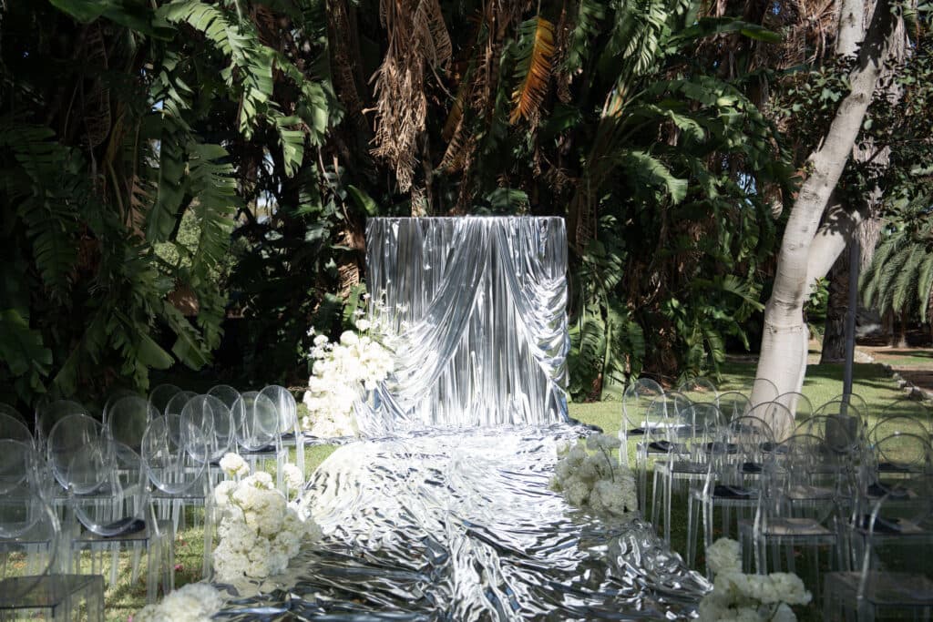 Of course, the pinnacle of the celebration was the nuptials. Loli’s creative vision was to have a metallic backdrop that cascaded into a carpet to create a makeshift aisle. It was an inventive way to stage a wedding set-up outdoors, and the silver accent was strikingly beautiful in a modern way. “I must say it was one of my favorite moments seeing it for the first time walking down the aisle,” shares Loli.