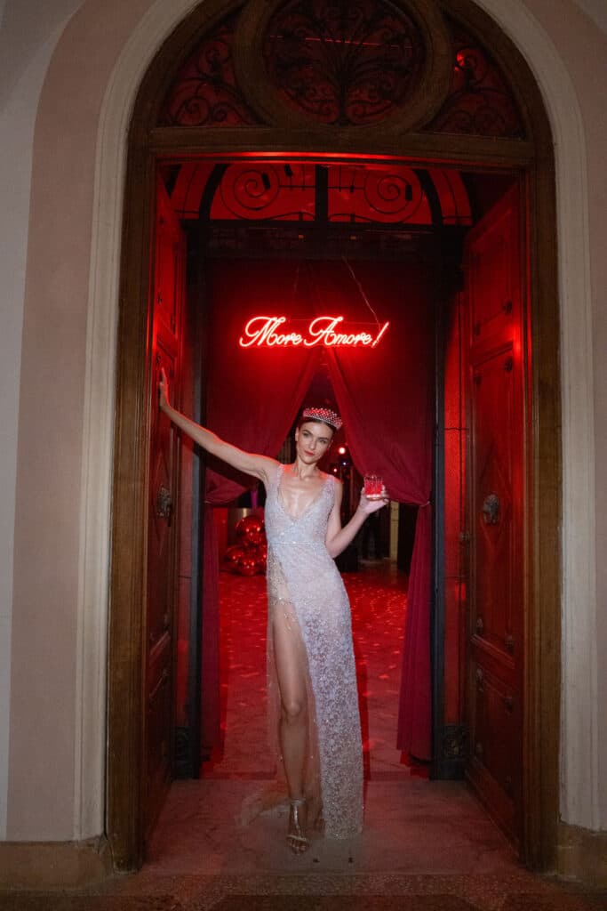 Afterward, the couple had their first dance as newlyweds, and champagne was served to celebrate. It was then that the special party room was opened for night-long dancing and drinks. Following the color palette, this cabaret-inspired room glowed with an entrance sign saying “More Amore!” while the interior shone with disco balls and laser lights.