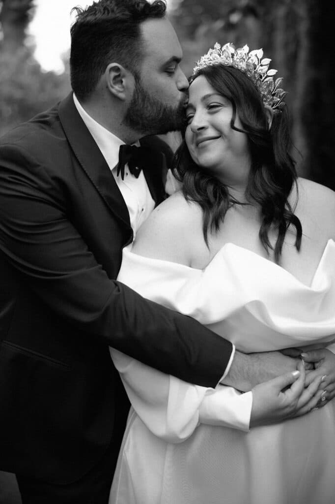 Stephanie stunned in a sculptural gown by Hera Couture from The Bride Lab: elegant, ethereal, and timeless. Her look was completed with a regal Viktoria Novak headpiece, Chanel heels, and Louis Vuitton jewels–an effortless blend of modern romance and classic grace.