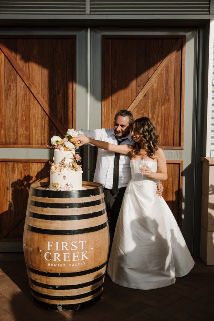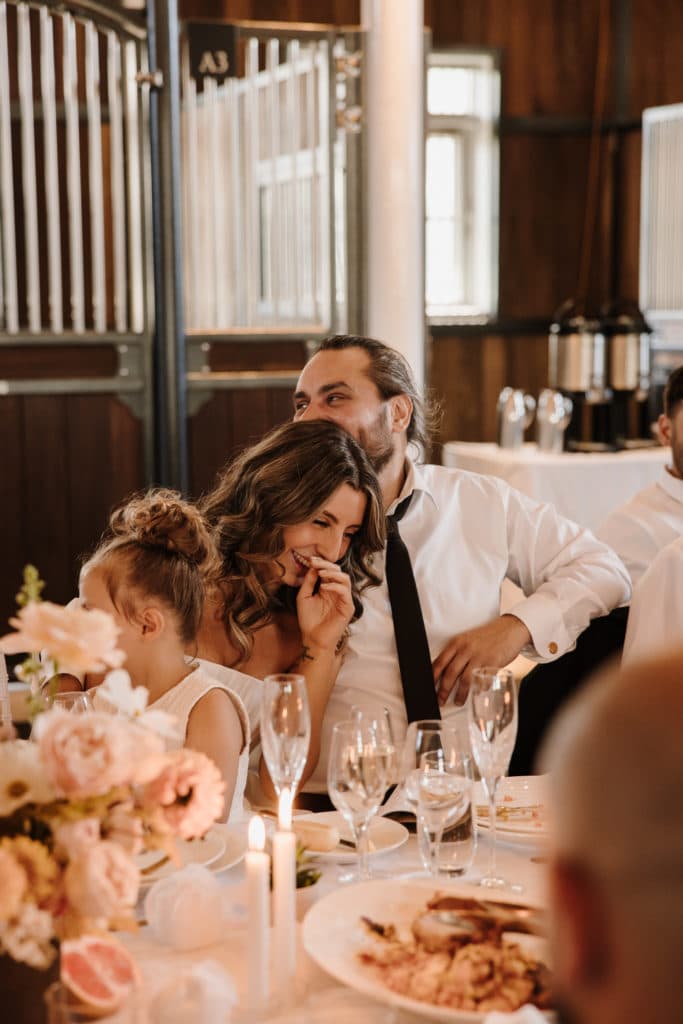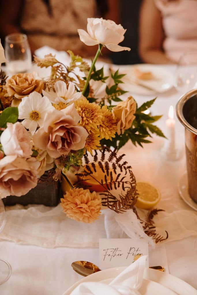 In terms of the vision, I had always loved a long full table with beautiful florals and grand table settings with a lot of cutlery and glassware. I consulted with Beth Abood from Dandy Flora, who created stunning arrangements for the table (which everyone also got to take home after our long lunch) and worked with Steph on the table settings and little items on the table like place cards and candles and bonbonnieres which were little candles I ordered in that looked like lemons, I wanted to keep it nice and fresh. I also knew the table setting would be stunning in the Big Barn at the venue. My friend Nicolle from Goldact Events also helped with the gold cutlery and helped us with the hiring of the white Tiffany chairs and linens. All these little elements came together, and the setting was beautiful. It really helped to have Steph there the day before and, on the day, making sure everything came together perfectly!