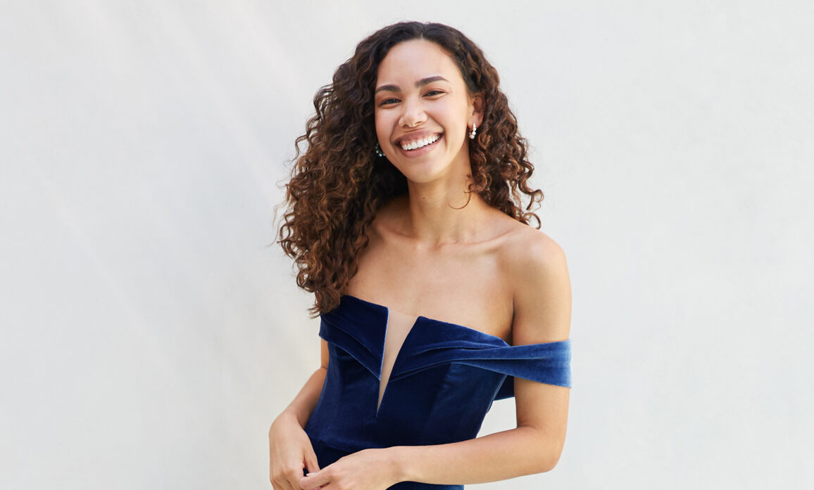 An update on the classic v-neck gown, this frock has a slight vertical ruching detail, which creases the velvet and adds chic dimension. Like most gowns, it features a universally flattering high waist, and a straightforward skirt that’ll be right at home in a black-tie affair.