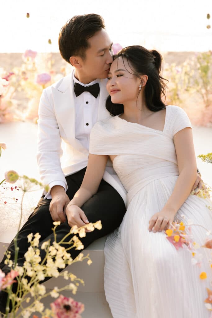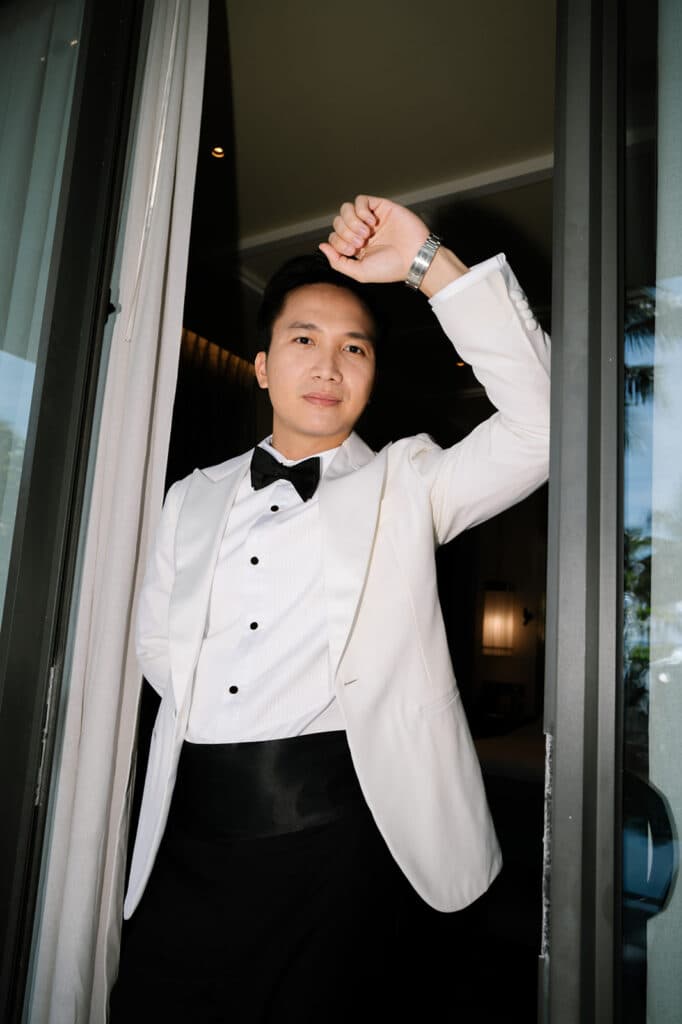 Vanny wore a breathtaking gown by Vietnamese fashion powerhouse Công Trí: sleek, sculptural, and supremely elegant. She paired it with earrings from Danh Hiển, a Van Cleef & Arpels bracelet, and a classic timepiece by Rolex. Victor wore a tailored suit by SIR Tailor and refined shoes by Cnes Shoemaker.