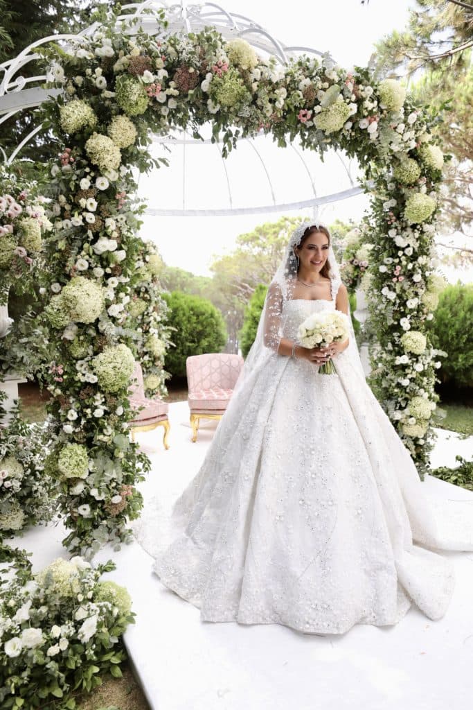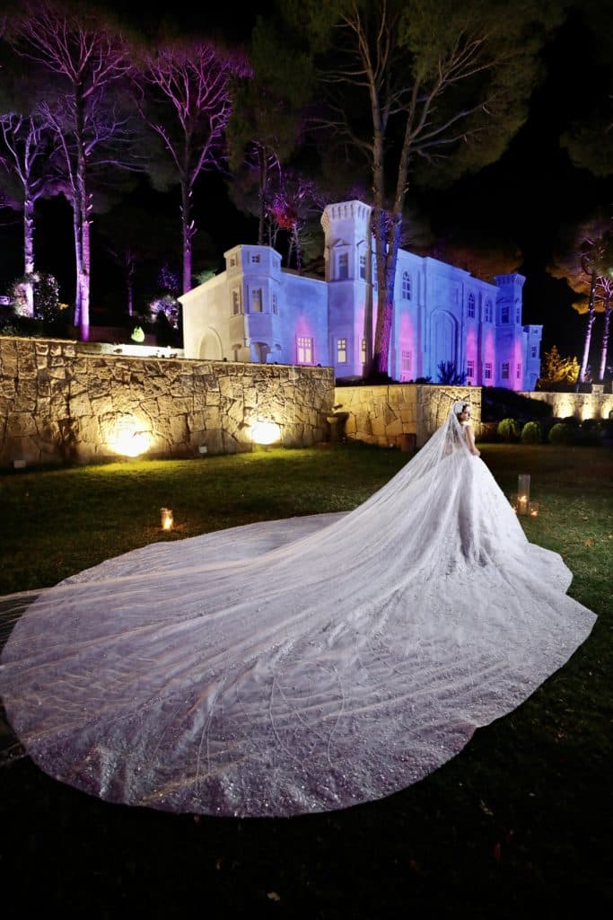 The wedding took place at Dar el Mir in Chouf, Lebanon as the couple “wanted to do the wedding in Lebanon to keep the traditions”. The Bride had “always wanted a day wedding in [her] parents’ home” and they chose this venue “because [they] wanted to feel magical and have a garden theme with loads of greenery”. Paul Nasr expressed that “the wedding design projected the character, traditions and profession of the Bride and Groom”. Elements from both partners’ personalities were incorporated into the wedding, their guests were introduced to a castle installation, 3D Mapping technology and an artistic vision like no other. Paul communicated that “The castle was the fairytale classical story the Bride always dreamed about and the huge wedding dance floor was the vision of the Groom since himself is an artist and a painter”.