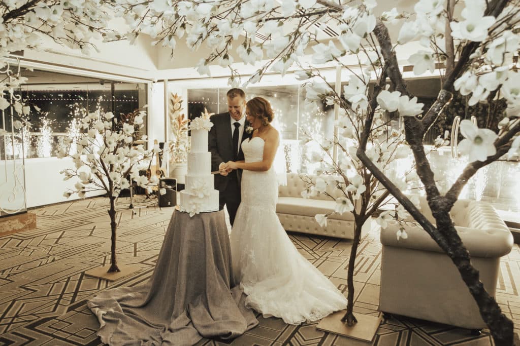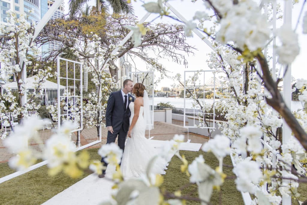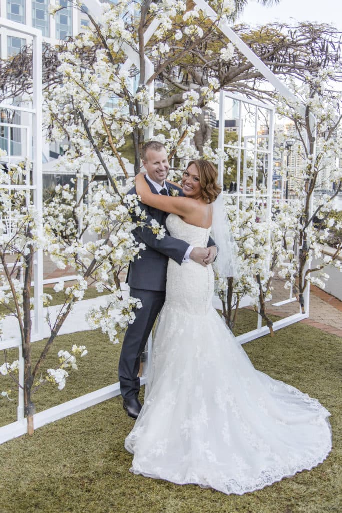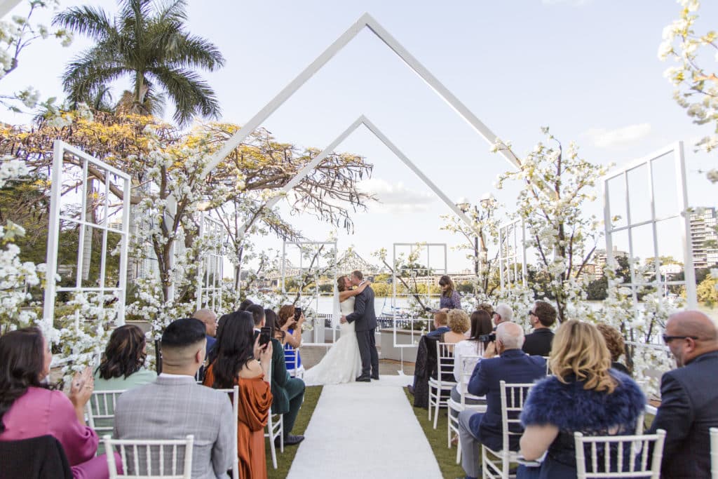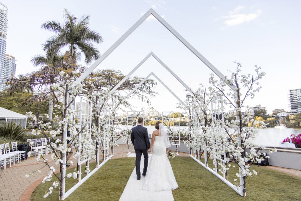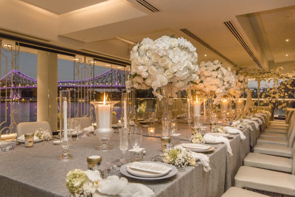 Planning & Styling: Alysia Bridger Events, Reception Venue: Blackbird Events, Ceremony Venue: Stamford Plaza Brisbane, Vases: White Label Hire, Floral Centrepieces: John Emmanuel Floral Events, Crystal Luxe Candles: U Light Me Up Candles, Bouquet: Florabella Design, Celebrant: Moore Celebrations, Flatware & Vases: Ivy And Bleu Events, Photography: Soda Photography, Videography: Lunasity Media, Groom’s Suit: Black Jacket Suiting, Stationery: Joyce May Designs, Custom Chocolates: Cocoture Chocolates, Cake: The Sweet Society Co., Place Setting Custom Florals: The Perfect Party Co., Pre-Wedding Treats: Scrumdiddliumptious Catering, Pyrotechnics: Skylighter Fireworks, Wedding Car: Our Wedding Cars, Hairstylist: House Of Zion Salon, Make-Up Artist: Carly Stone MUA, Blossom Branches & Magnolia Tree: The Blossom Tree Company, Cakes in A Jar: The Mason Baker, Ceremony Chairs, Aisle & Linen: Beautiful Weddings Australia, Custom Chapel Build: Honeytub Wedding Hire, Music: Siena Larsson Music