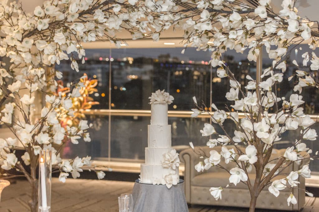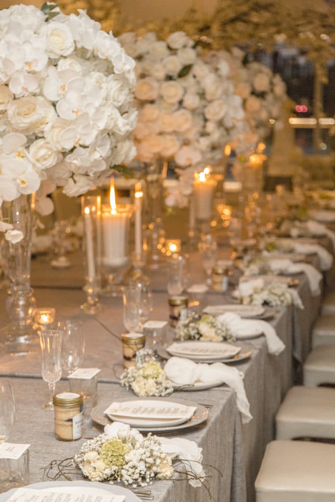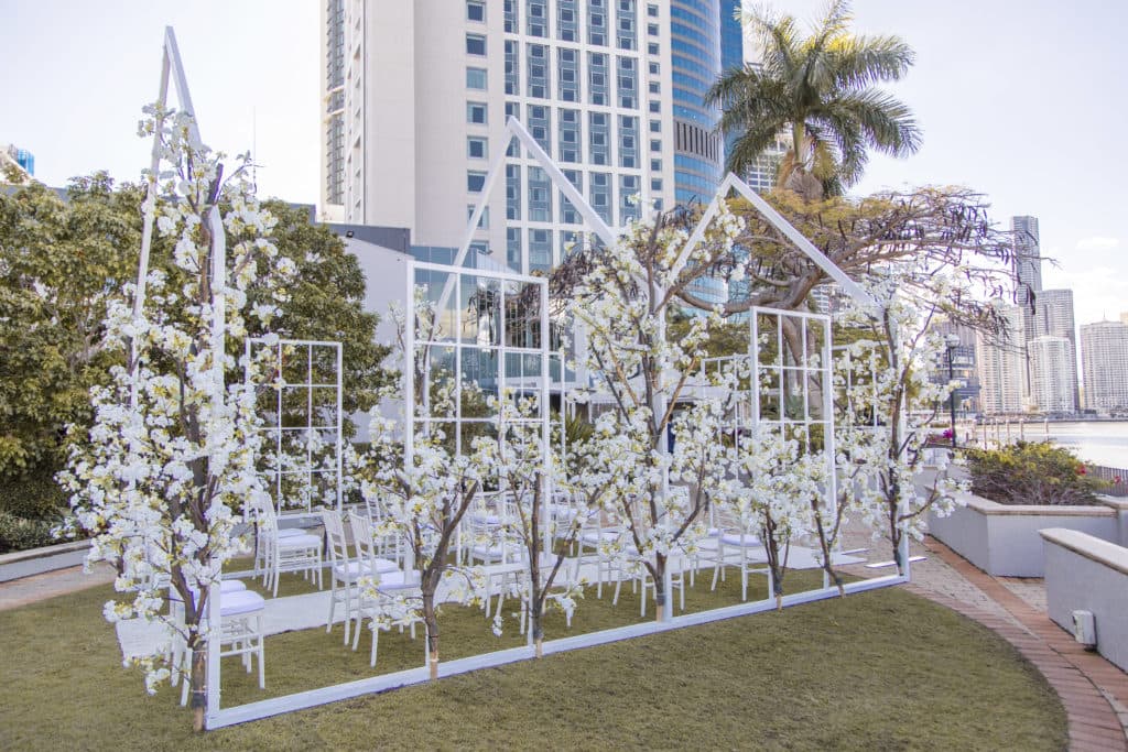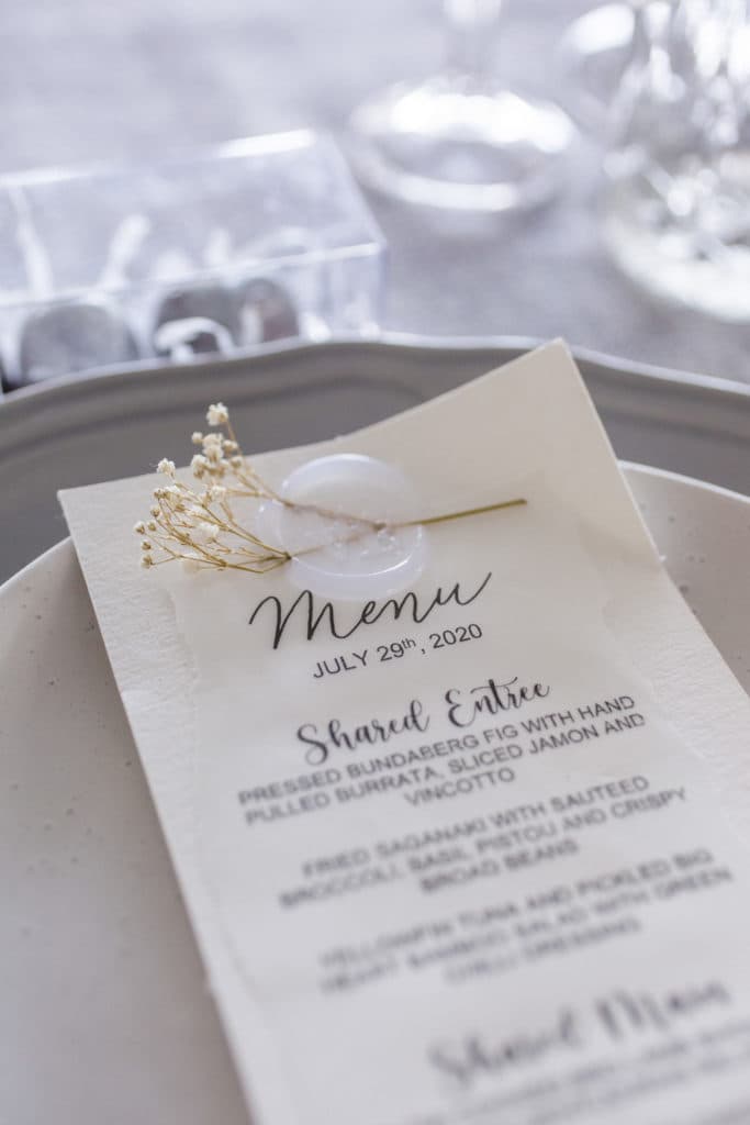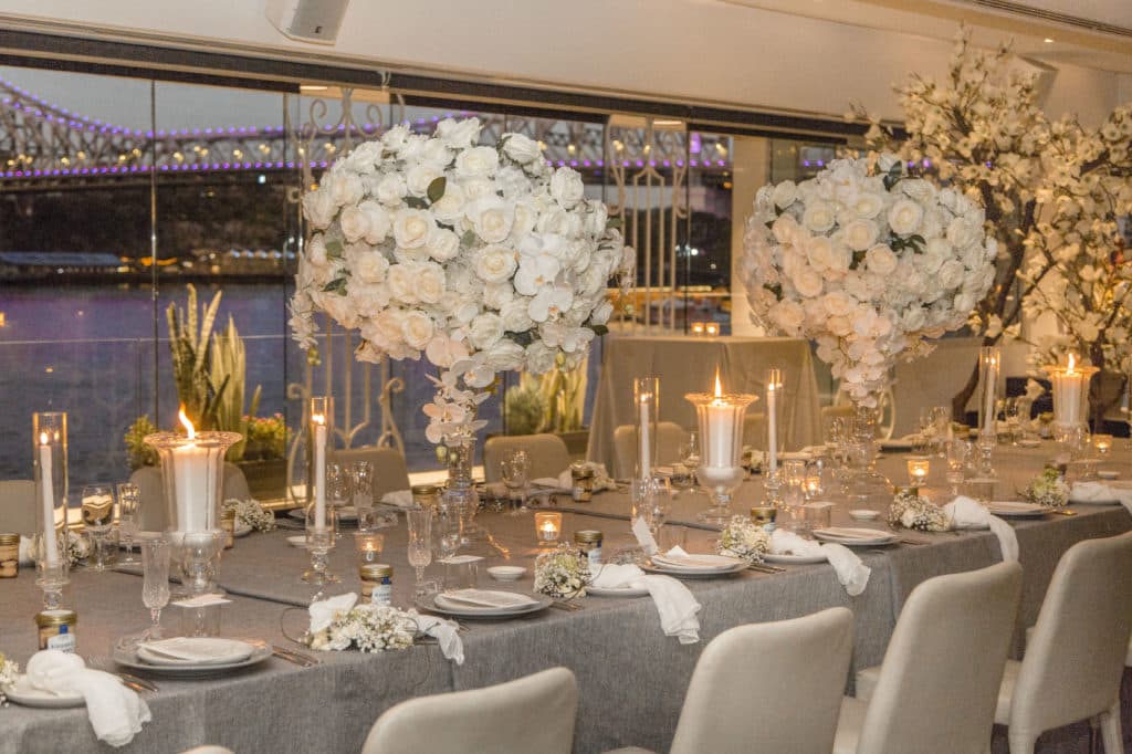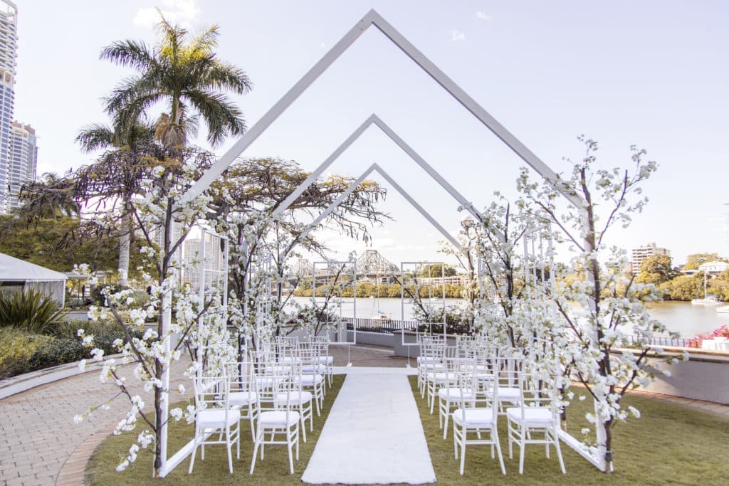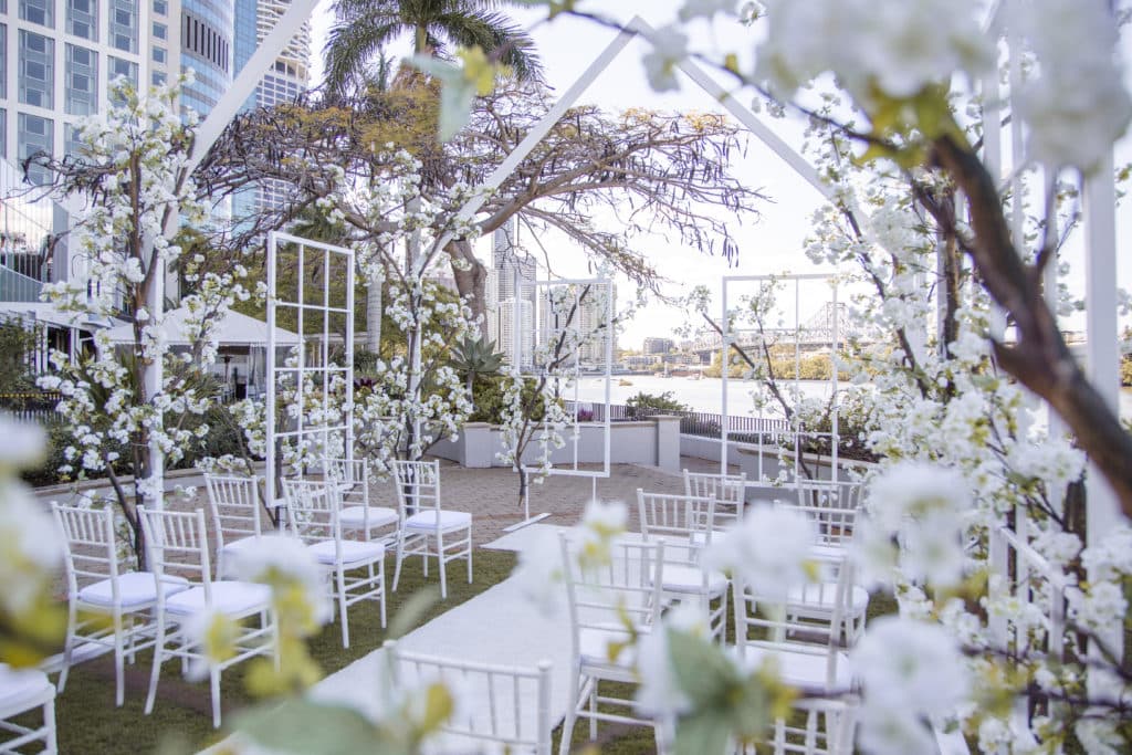 Planning & Styling: Alysia Bridger Events, Reception Venue: Blackbird Events, Ceremony Venue: Stamford Plaza Brisbane, Vases: White Label Hire, Floral Centrepieces: John Emmanuel Floral Events, Crystal Luxe Candles: U Light Me Up Candles, Bouquet: Florabella Design, Celebrant: Moore Celebrations, Flatware & Vases: Ivy And Bleu Events, Photography: Soda Photography, Videography: Lunasity Media, Groom’s Suit: Black Jacket Suiting, Stationery: Joyce May Designs, Custom Chocolates: Cocoture Chocolates, Cake: The Sweet Society Co., Place Setting Custom Florals: The Perfect Party Co., Pre-Wedding Treats: Scrumdiddliumptious Catering, Pyrotechnics: Skylighter Fireworks, Wedding Car: Our Wedding Cars, Hairstylist: House Of Zion Salon, Make-Up Artist: Carly Stone MUA, Blossom Branches & Magnolia Tree: The Blossom Tree Company, Cakes in A Jar: The Mason Baker, Ceremony Chairs, Aisle & Linen: Beautiful Weddings Australia, Custom Chapel Build: Honeytub Wedding Hire, Music: Siena Larsson Music
