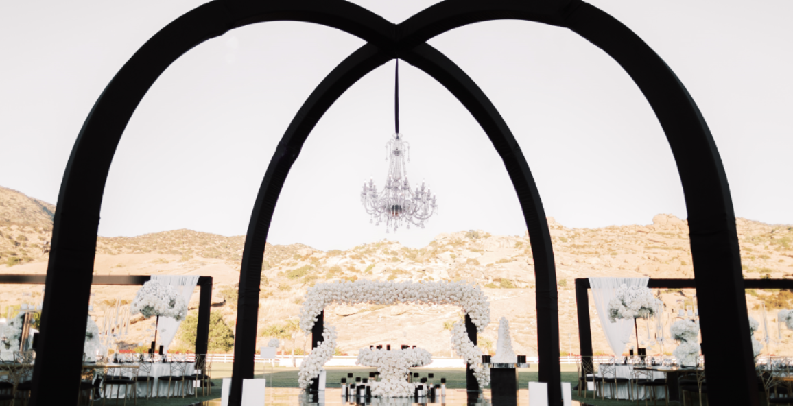 We have never seen anything like this, Fairies! Martin and Rosie have set a trend, by having gigantic black arches at their outdoor wedding. We are obsessed with this abstract concept, and particularly love the contrast that it creates against the mountainous foreground! The couple followed the classic theme of black & white, maintaining a simple, yet elegant pattern. The black architectural arches shaped the outdoor location of the Wedding, as crystal chandeliers hung and white floral